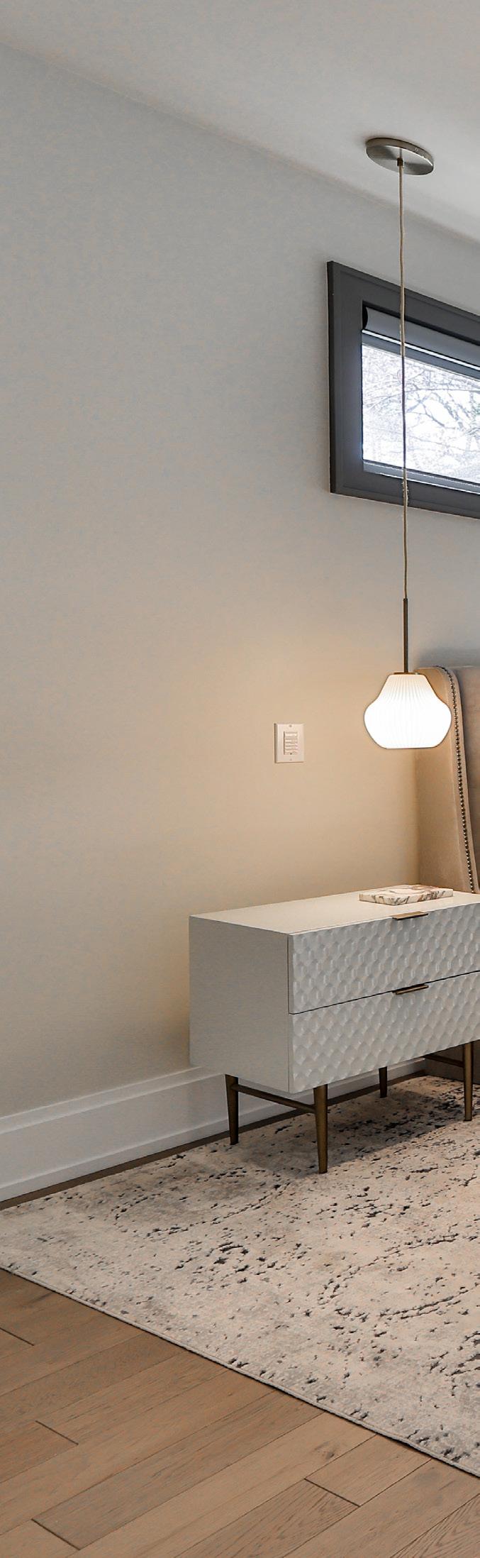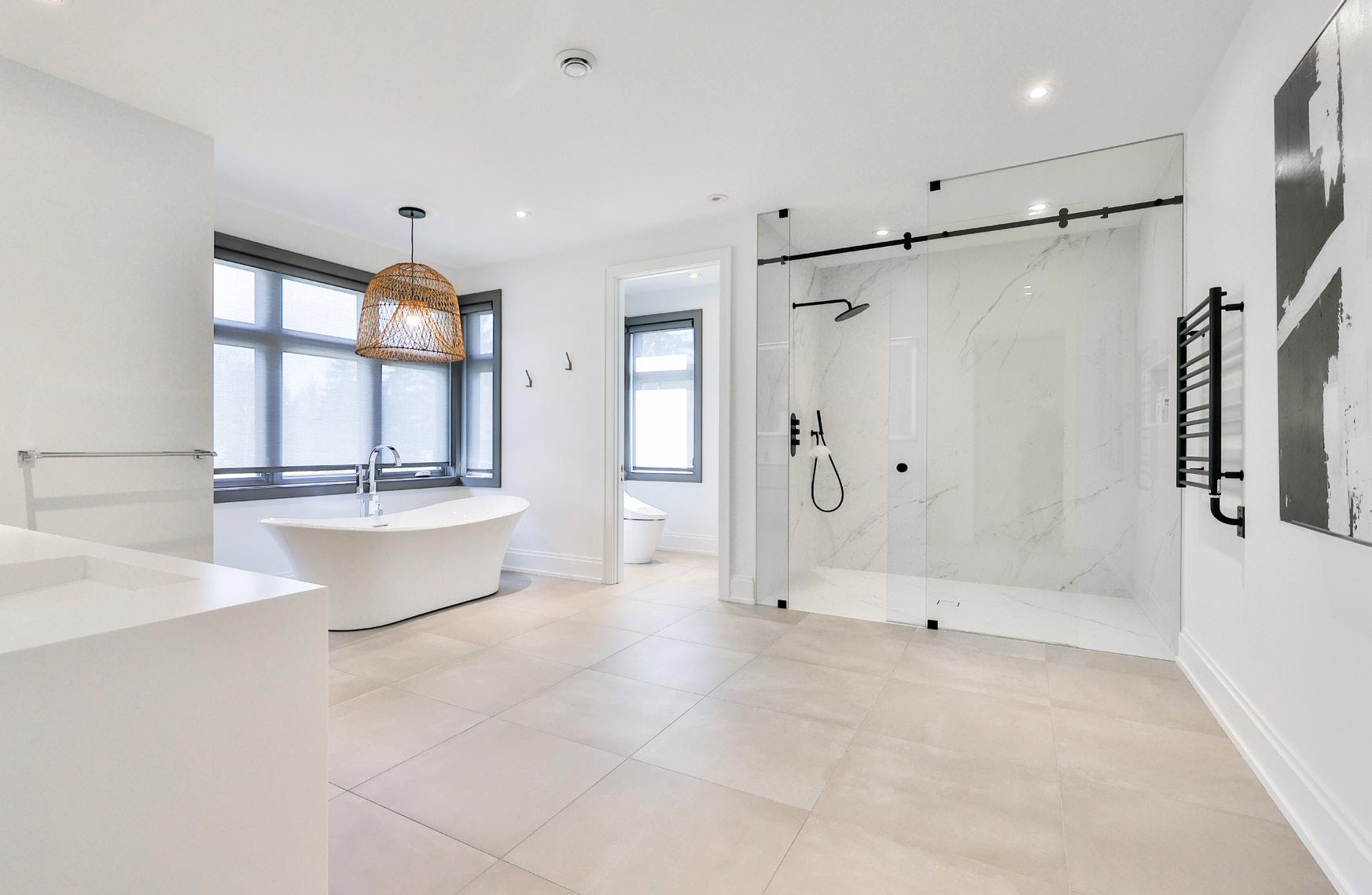 Adjacent to the bedroom lies the luxurious 5-piece ensuite, accessible via a sleek pocket door entry. Here, indulge in relaxation with a custom suspended floating double vanity and a freestanding soaker tub, perfect for unwinding after a long day. The oversized glass shower, featuring a seamless glass enclosure and porcelain tile walls, invites you to experience the soothing cascade of water from the rainfall showerhead or handheld showerhead. Pamper yourself with the indulgence of a heated towel rack, while enjoying natural light streaming in through the picture window overlooking the front garden, complete with custom roller shades for added privacy. A bidet/toilet enclosed in a water closet offers additional privacy and convenience. Completing this oasis is an overhead chandelier casting a soft glow, adding a touch of elegance to the space, all atop heated 24” x 24” porcelain tile floors that ensure warmth and comfort with every step.