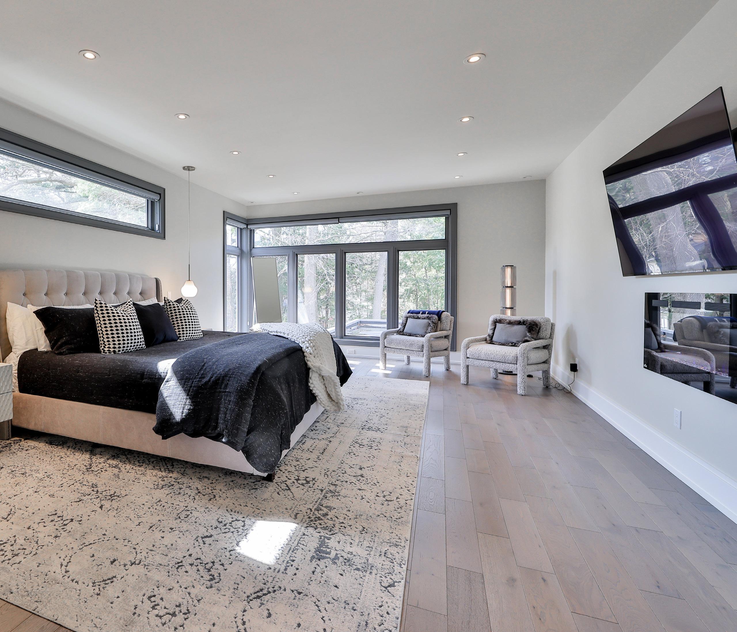 As you step into this primary bedroom, you’re greeted by a massive walk-in closet adorned with custom built-in organizers, ensuring ample space for your wardrobe essentials. The ambiance is further enhanced by the warmth of a Napoleon electric fireplace, casting a soft glow across the room. Wall-to-wall windows offer breathtaking views of the serene backyard oasis and sparkling pool, while custom window coverings provide privacy when desired. Storage is never an issue with an additional closet conveniently tucked away. Illuminated by both pot lights and pendant lights, the space exudes a soft, inviting glow, complementing the heated engineered brushed oak hardwood floors underfoot.
