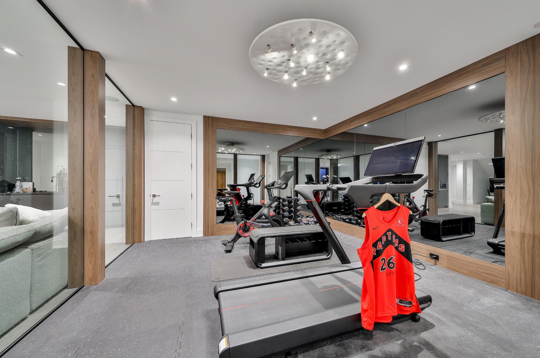 In the glass-enclosed fitness room, embark on a journey to wellness and vitality. Reflective mirrored walls create an energizing atmosphere, while rubber mat flooring ensures comfort and safety during workouts. Equipped with state-of-the-art exercise equipment, including cardio machines and free weights, the fitness room invites you to pursue your fitness goals with determination and vigor. Indulge in relaxation and rejuvenation in the luxurious 7-person sauna, offering the perfect retreat to unwind and soothe the senses. The home office, currently repurposed as a sixth bedroom, boasts the elegance of pot lights and the warmth of heated engineered brushed oak hardwood flooring.