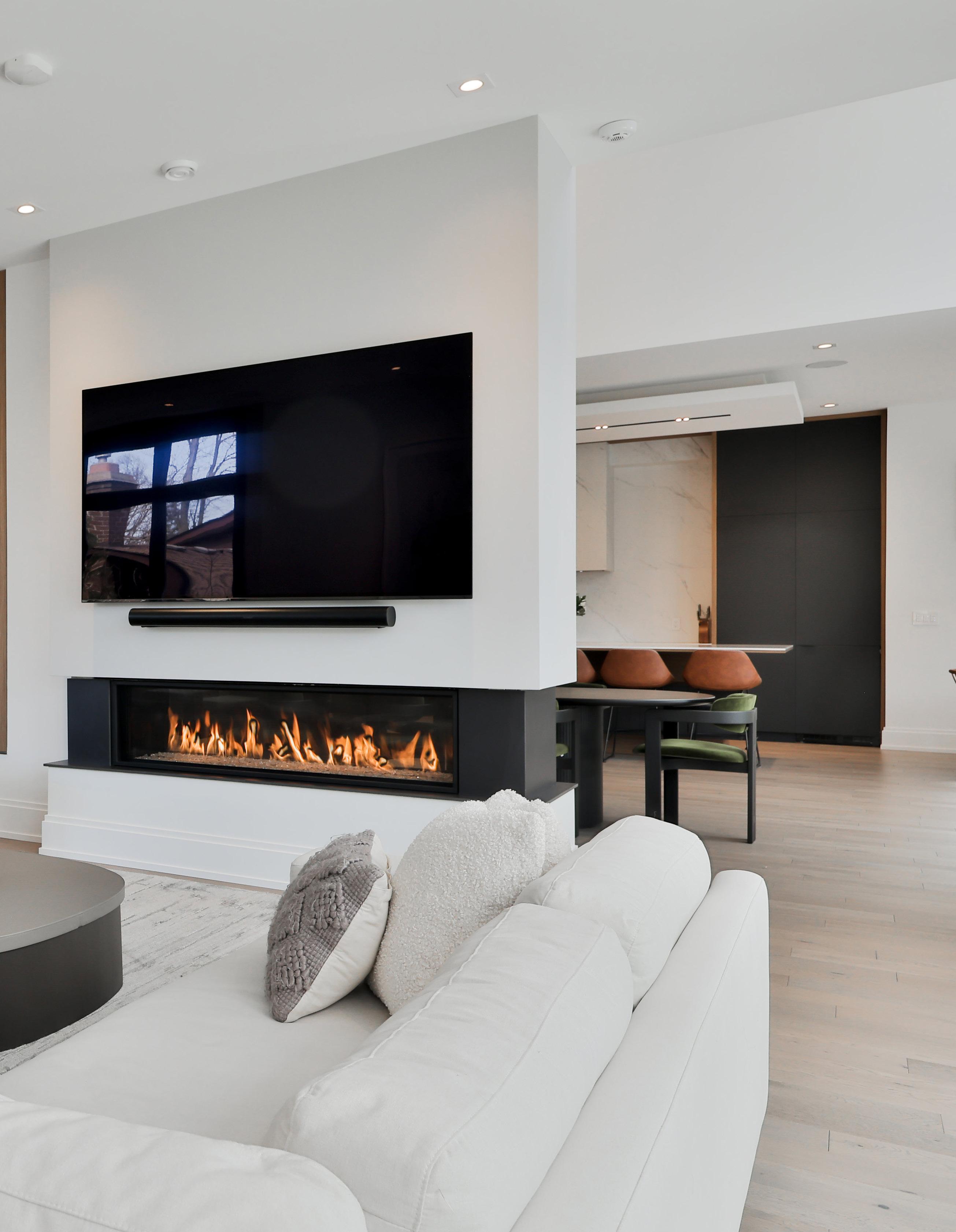 The family room beckons with its warm ambiance, featuring a high-efficiency two-way gas fireplace that creates a cozy atmosphere for intimate gatherings. Floor-to-ceiling windows bathe the room in natural light, offering panoramic views of the lush backyard oasis. A wall of transom windows adds architectural interest while allowing ample daylight to filter through, enhancing the inviting charm of this space. With built-in ceiling speakers, the family room is the perfect retreat for relaxation and unwinding after a long day.