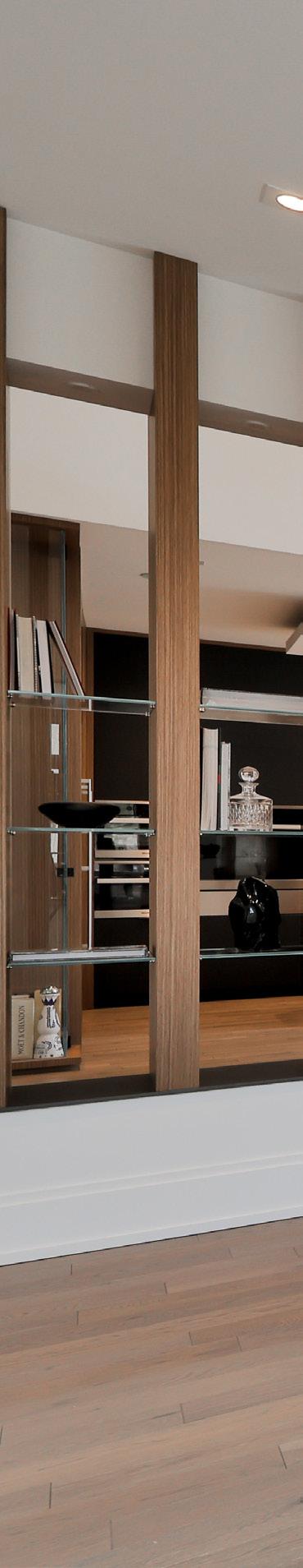 Adjacent to the family room, the dining room exudes grandeur with its soaring 20-foot ceiling and open-concept design. A high-efficiency two-way gas fireplace serves as a focal point, providing warmth and ambiance during formal dinners or casual family meals. A striking 20-foot feature window overlooks the meticulously landscaped backyard, offering breathtaking views year-round. With seamless transitions to the adjoining kitchen and breakfast area, the dining room sets the stage for memorable dining experiences and lively conversations among family and friends. Tucked away for privacy, the office on the main level offers a quiet retreat for work or study. Bathed in natural light from floor-to-ceiling windows, this sophisticated space boasts custom built-in cabinets and glass shelving, providing ample storage and display options for books, decor, and personal items. Engineered wood feature walls add warmth and texture, while built-in ceiling speakers create an immersive audio experience. Whether used as a home office, library, or study area, this versatile space combines functionality with elegance, making it a perfect sanctuary for productivity and concentration.