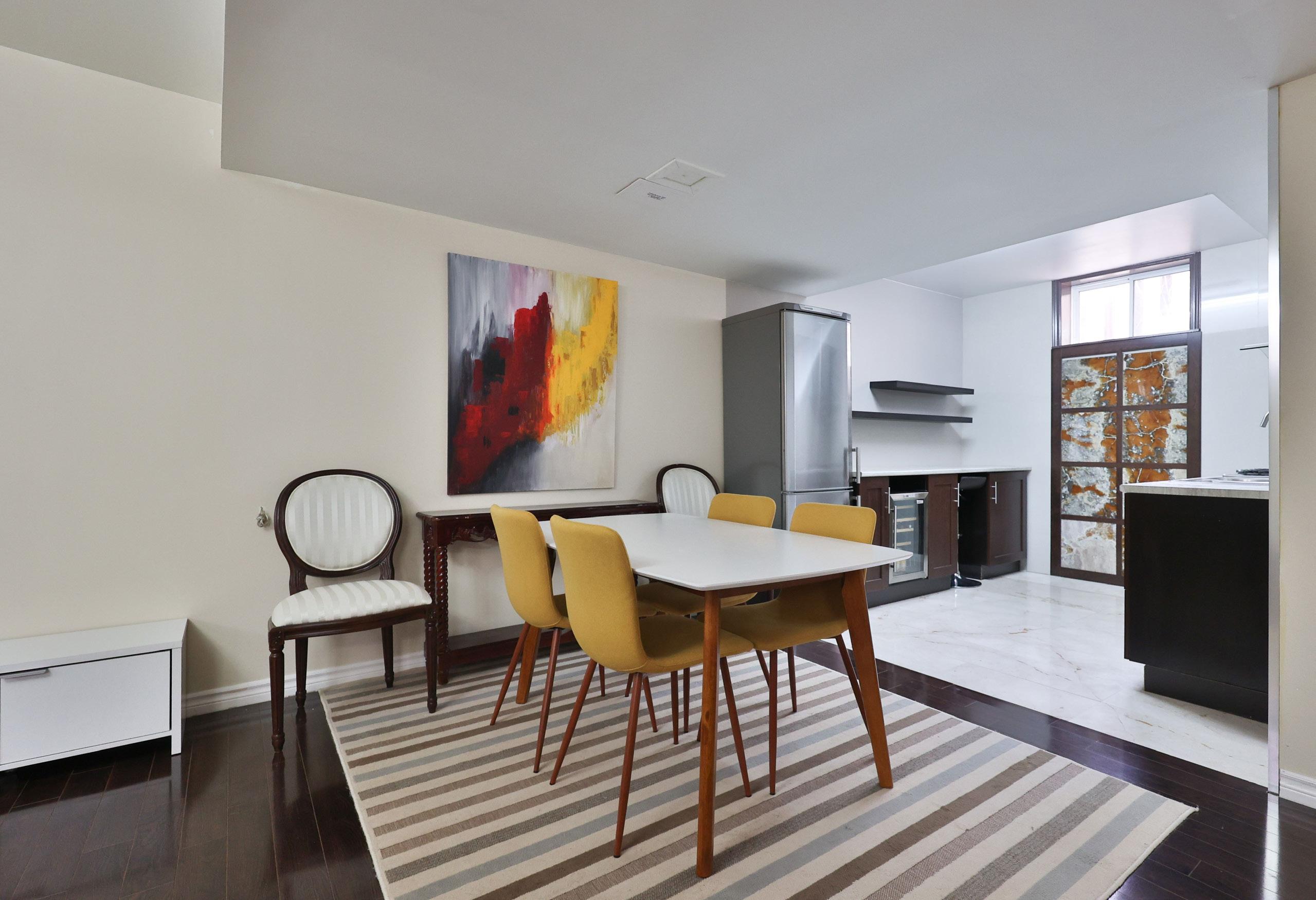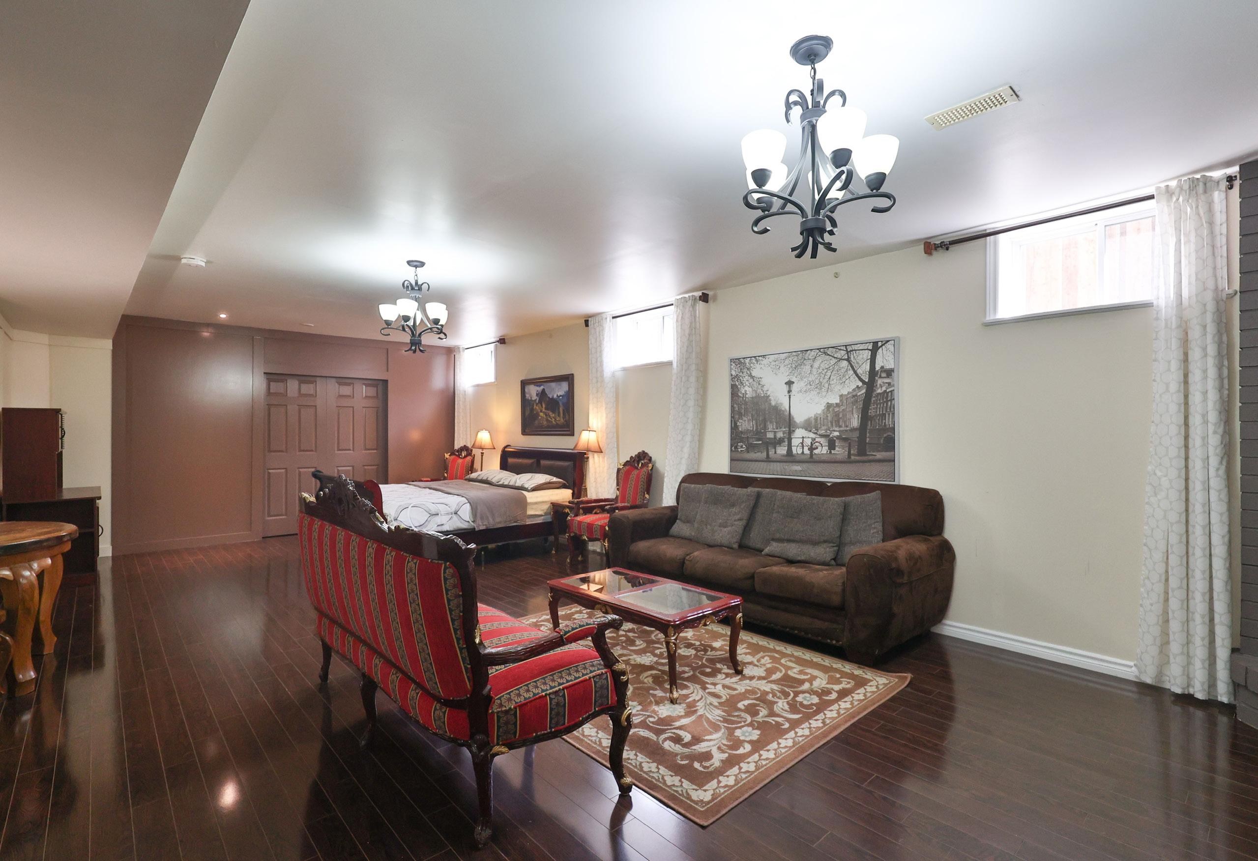 The lower level reveals a remarkably versatile, fully functional studio-style suite, elevated by impressive 8’3” ceilings and large above-grade windows that fill the space with natural light. Thoughtfully updated with contemporary finishes, including laminate and marble flooring and stainless steel appliances, this level seamlessly integrates kitchen, living, dining, and sleeping areas, alongside a beautifully renovated bathroom, ideal for extended family, guests, or potential income opportunities.