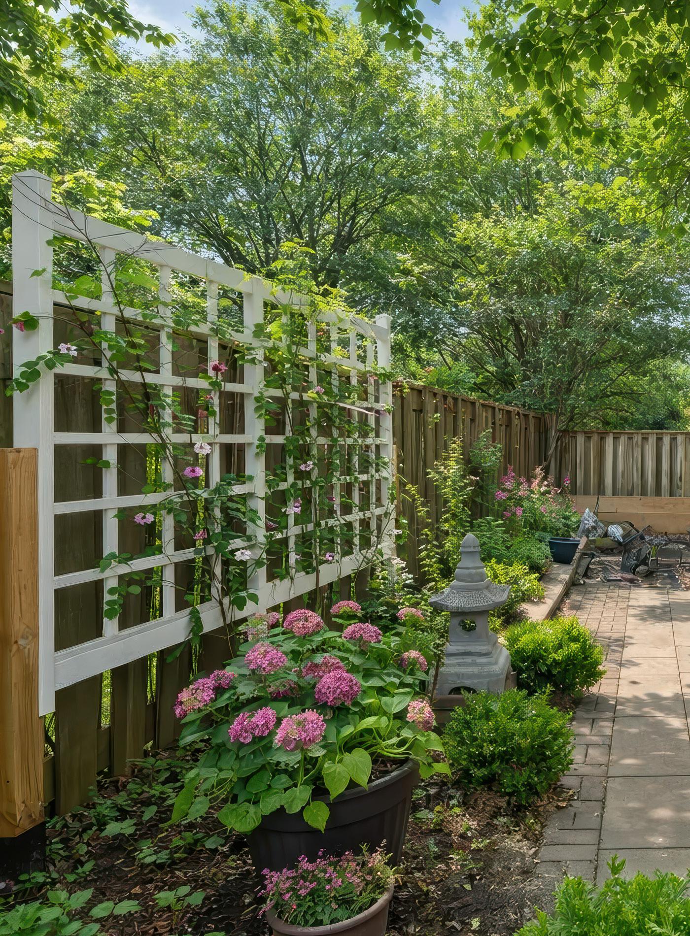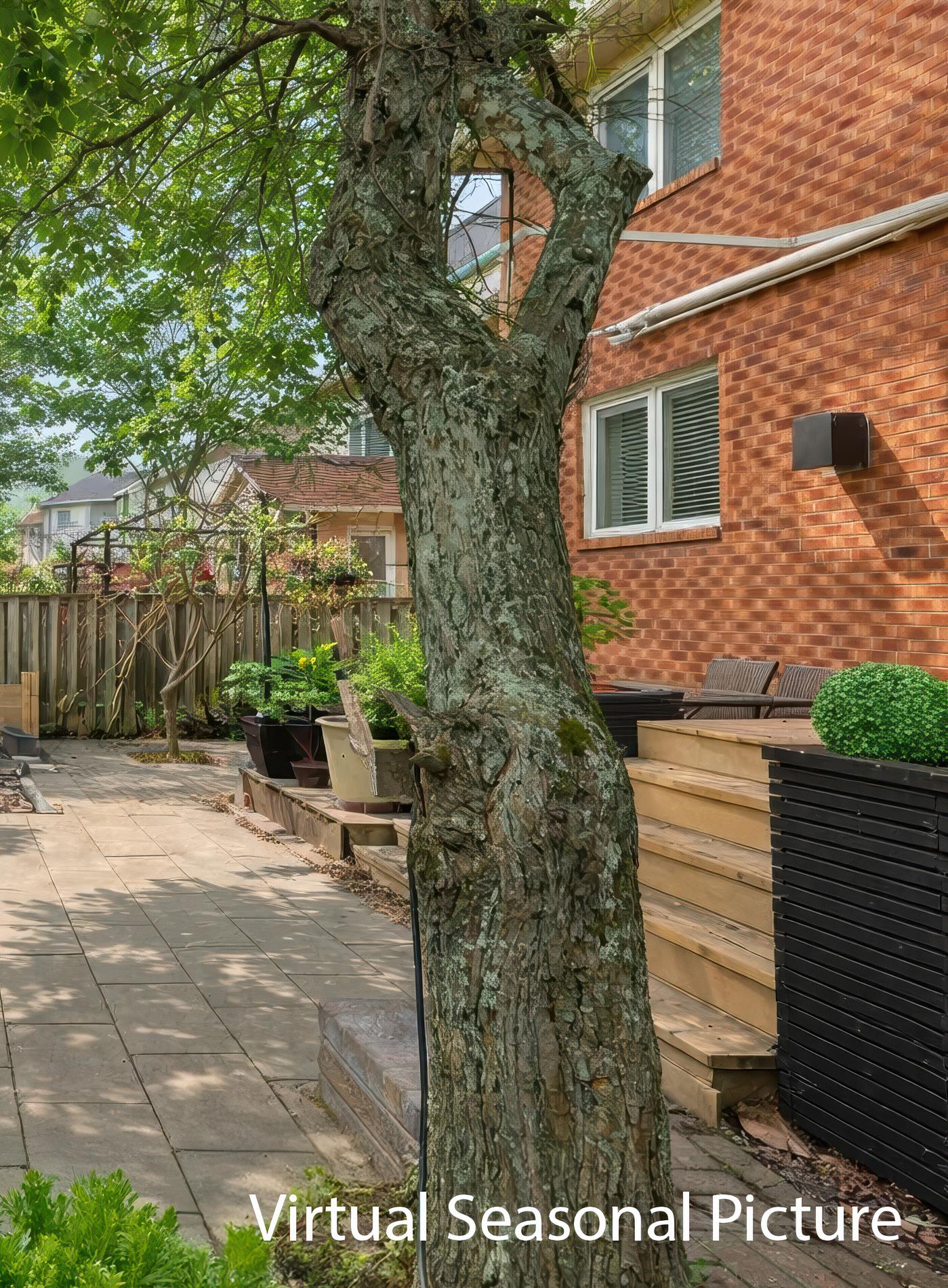 Outdoors, the backyard transforms into a serene retreat, where a multi-level raised deck with retractable awnings sets the stage for alfresco dining and summer entertaining. Surrounded by lush greenery, including an apple tree, cherry tree, and elegant Japanese maples, the garden evokes a peaceful, almost zen-like atmosphere, perfect for unwinding in complete privacy.