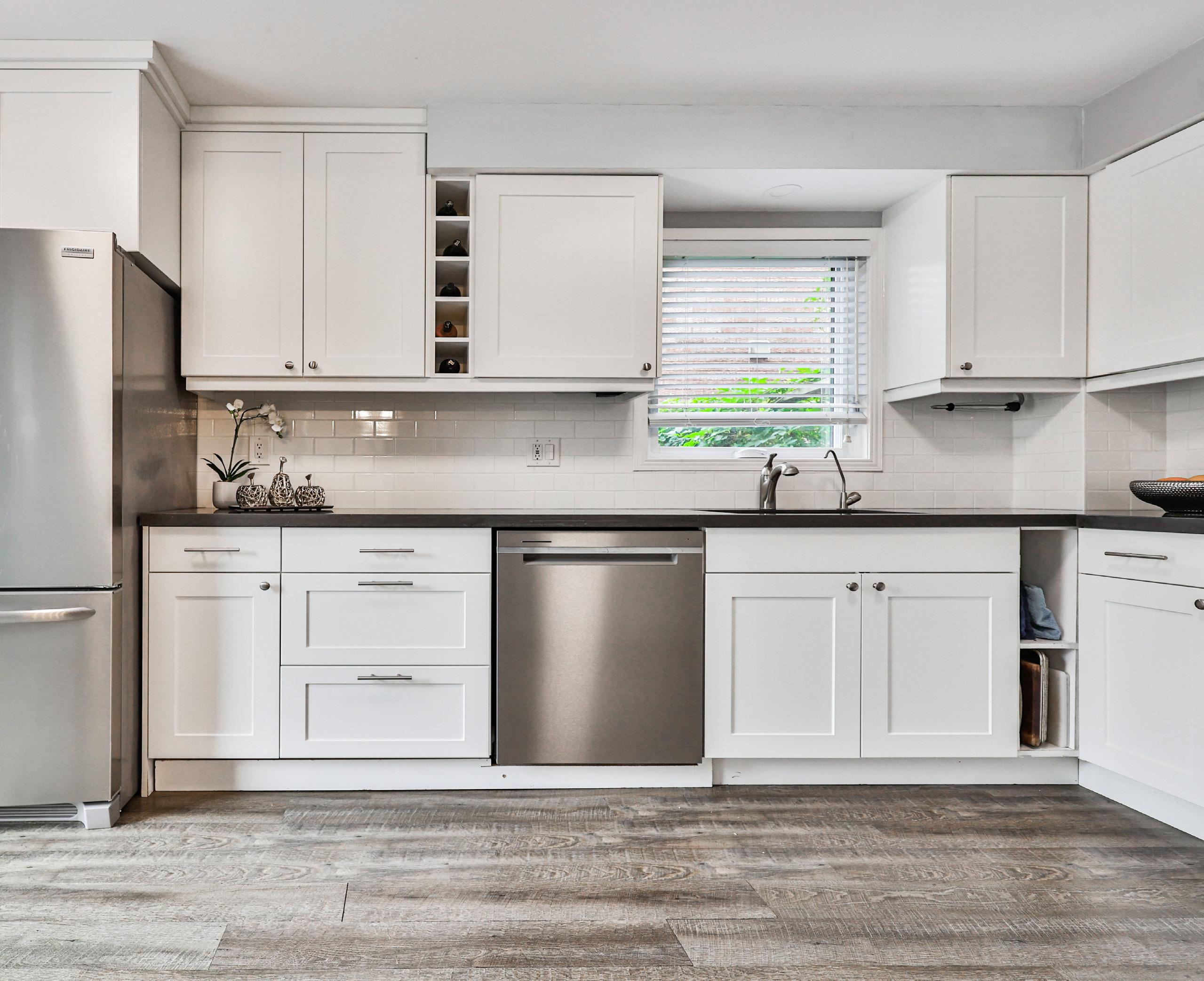 The kitchen showcases a perfect marriage of form and function. Gleaming quartz countertops provide a beautiful, durable surface for all your culinary creations while soft-closing drawers and shaker-style cabinetry offer an abundance of storage space for all your kitchen essentials. The white subway tile backsplash adds a touch of timeless elegance, while the new stainless steel appliances, including a fridge and dishwasher, elevate the kitchen to a new level of sophistication.