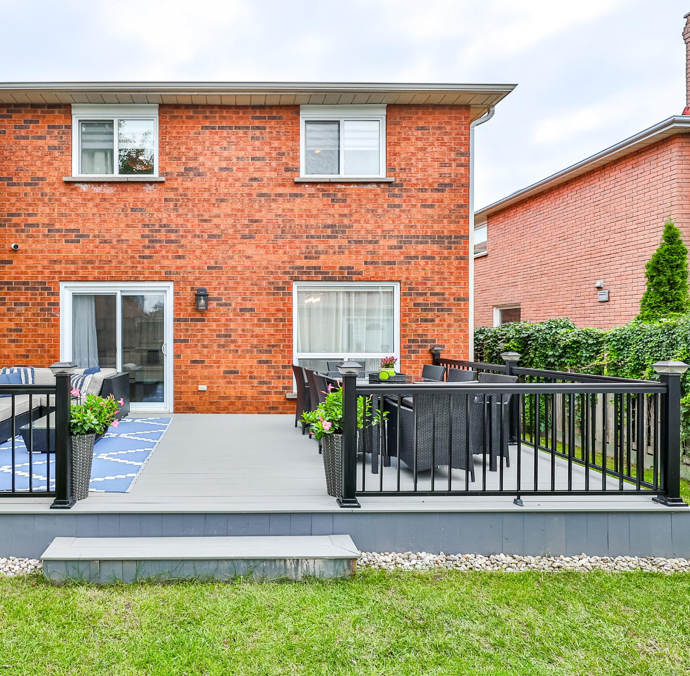 The focal point of the backyard is a raised, composite deck adorned with ambient sconce and solar lighting. It’s an idyllic setting for outdoor dining, relaxation, or simply basking in the sun. Whether you’re hosting a summer barbecue or enjoying a quiet evening under the stars, this deck offers the perfect backdrop.