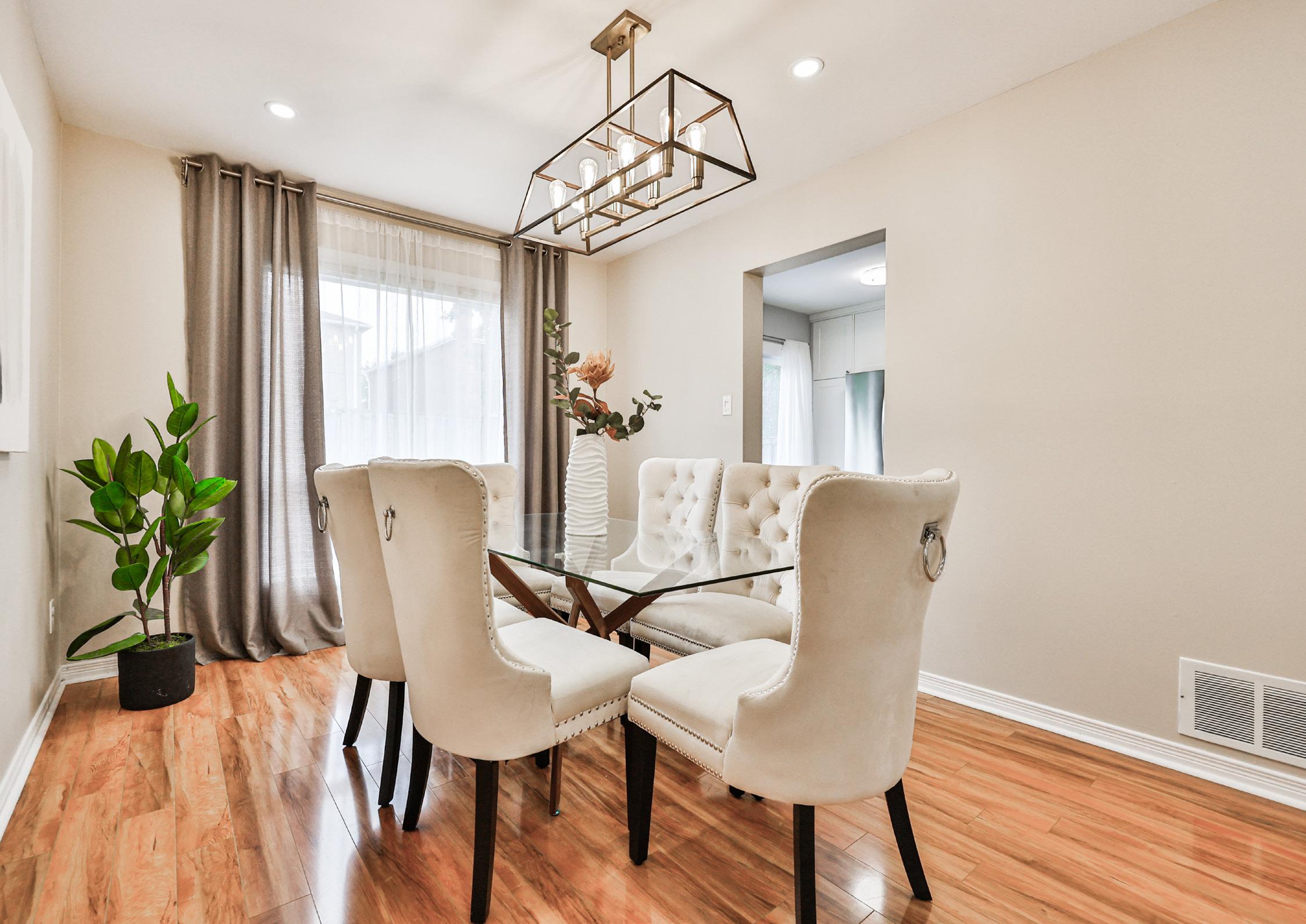The living spaces seamlessly combine comfort and harmony. In the living room, you’ll find a spacious seating area, perfect for entertaining guests in style. Large windows offer picturesque views of the side yard, allowing natural light to flood the room. The subtle charm of pot lights adds to the ambiance, creating a warm and inviting atmosphere. This living room seamlessly combines with the dining room, enhancing the flow of the home. In the dining room, windows frame a delightful view of the backyard, while a fresh overhead light fixture and additional pot lights impart a touch of elegance. For those seeking a more intimate setting, the family room awaits, complete with an electric fireplace with a brick surround and mantle. A built-in bench adds a touch of functionality, while the ceiling fan and well-placed windows that look out to the side yard create a comfortable, inviting atmosphere, making it the perfect space for more formal occasions.
