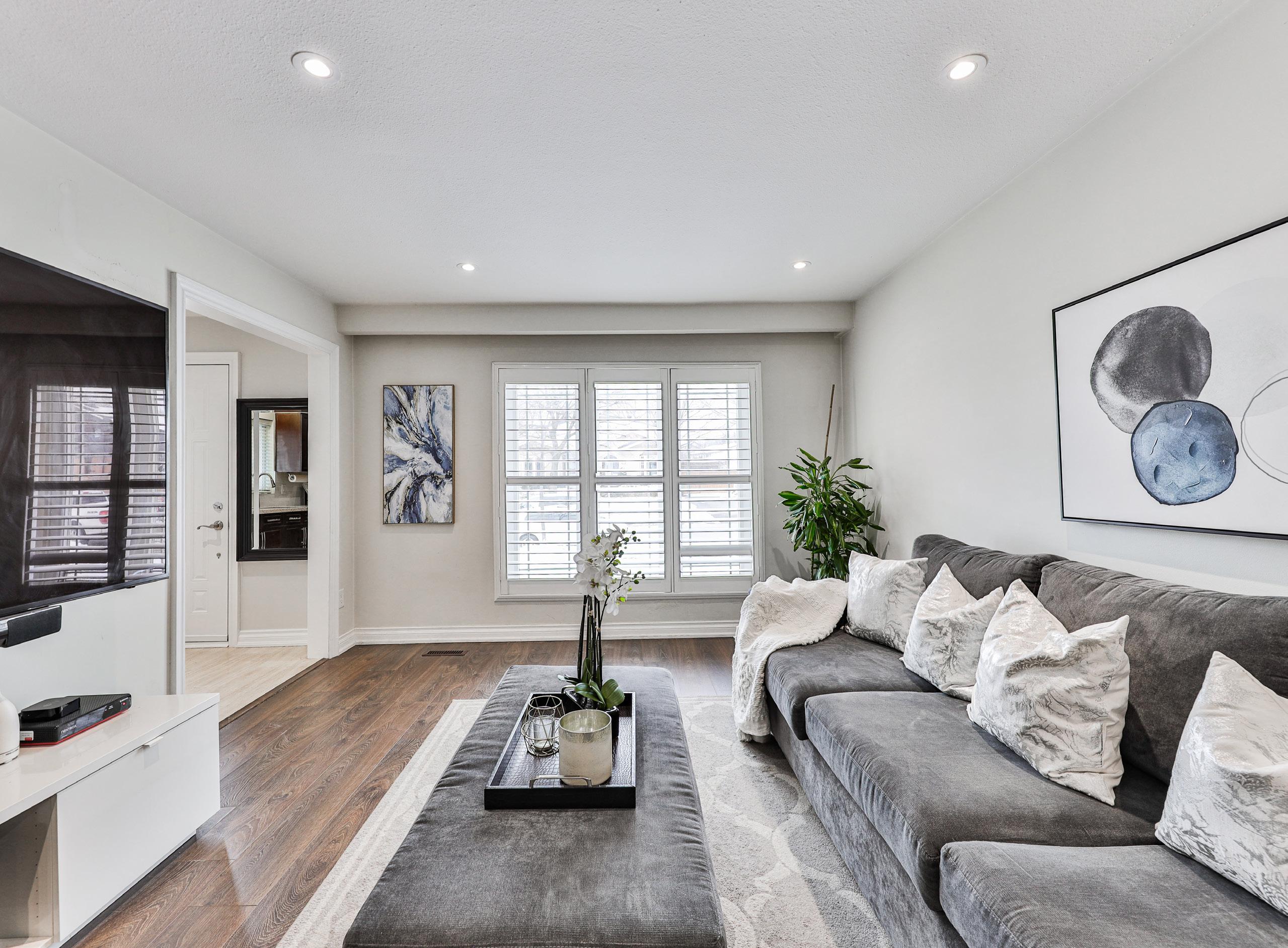 As you approach the driveway, be greeted by the inviting front porch patio and a convenient separate side door entrance to the lower level unit. As you enter through the foyer, adorned with sliding door closets and custom built-ins, you’re greeted by an ambiance of elegance. The open-concept living room, bathed in natural light pouring through large windows, invites relaxation and socialization. Adjacent, the dining room offers a seamless flow for entertaining, complete with its own set of pot lights and laminate flooring, creating a space where every meal