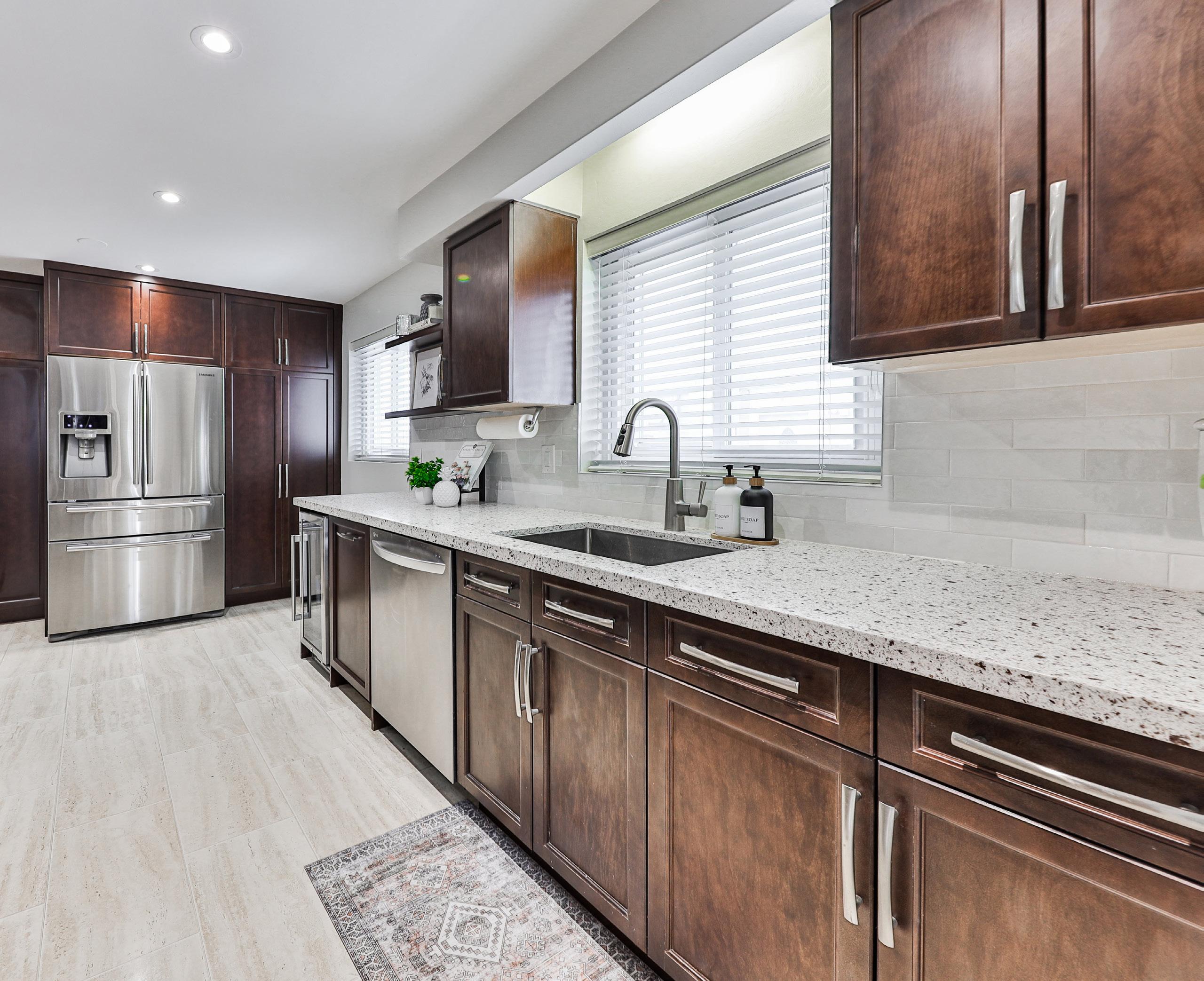 Indulge in the epitome of modern convenience with a suite of highend appliances, including a Samsung stainless-steel French door fridge boasting a lower freezer and an ice + water dispenser, a Frigidaire 5-burner electric stove with a lower oven, and a Panasonic built-in stainless-steel over-the-range microwave. Accompanying these marvels is an LG stainless-steel dishwasher, ensuring effortless cleanup after culinary triumphs. To quench your thirst for perfection, a NIPUS beverage fridge stands ready to chill your favorite refreshments to perfection.