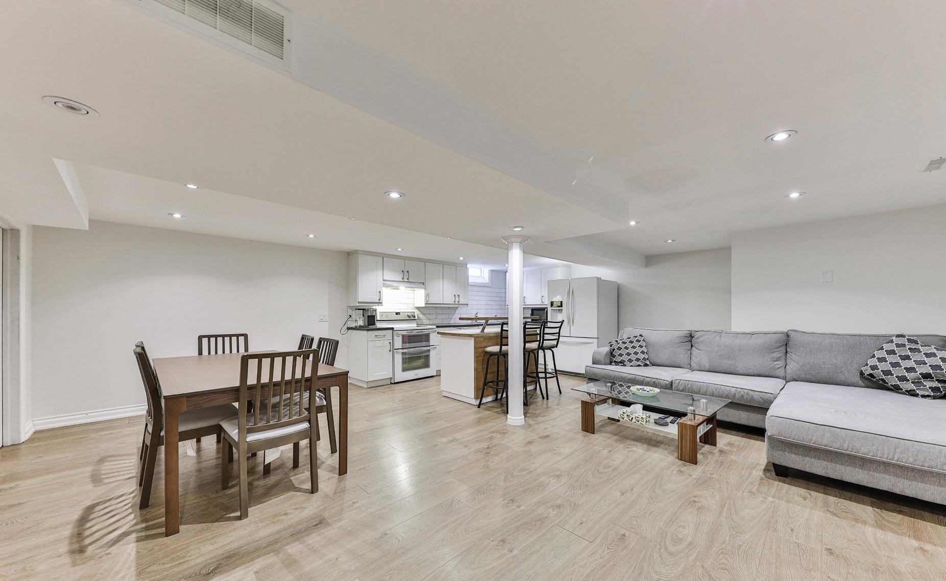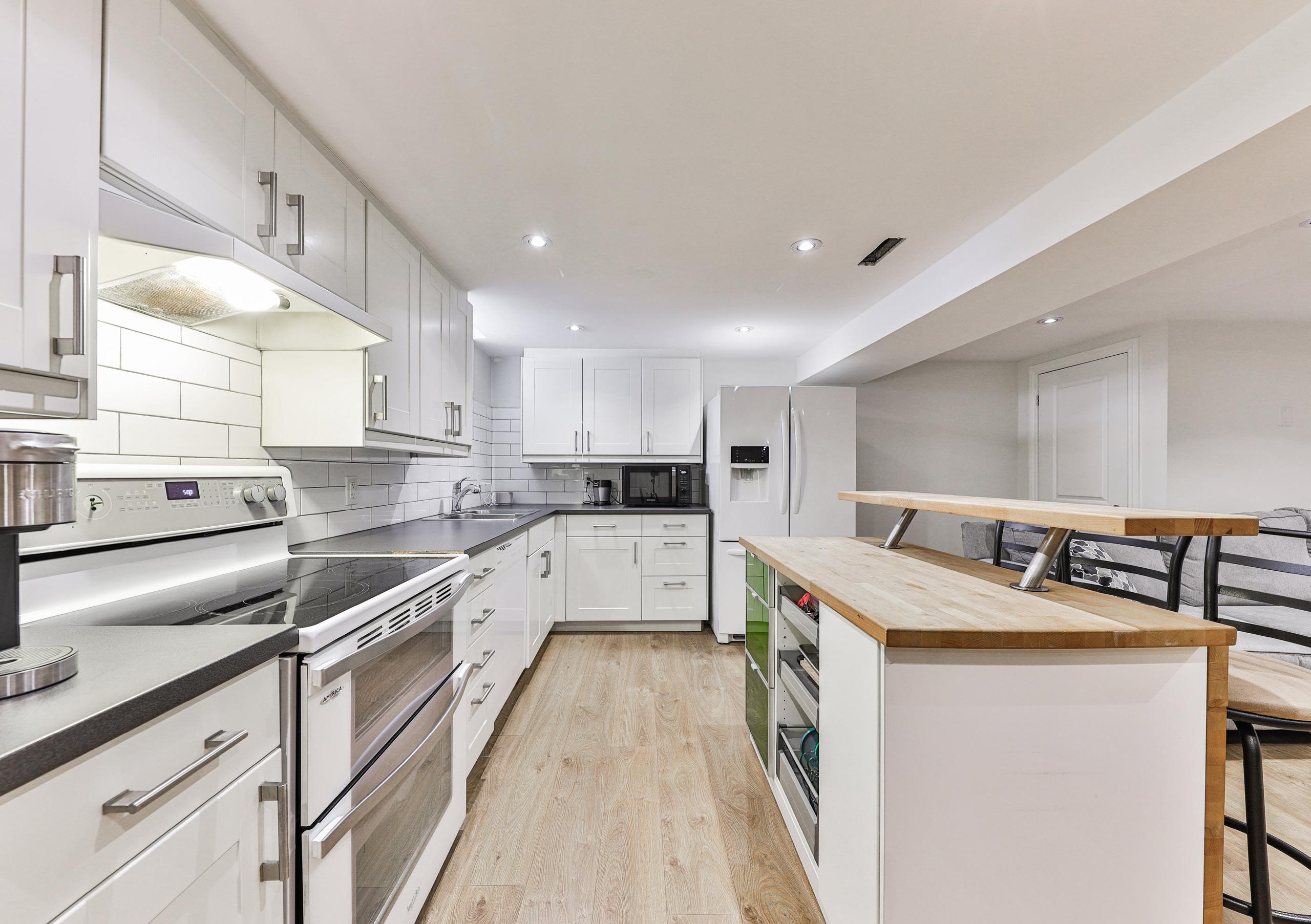 As you descend the staircase, adorned with a light fixture guiding your way, you’re greeted by an open-concept living room that beckons you to unwind and indulge in moments of tranquility. Illuminated by the soft glow of pot lights and adorned with laminate flooring, this inviting space provides the perfect setting for cozy gatherings or quiet evenings at home. Adjacent to the living room lies the heart of the lower level - the kitchen. This culinary sanctuary is adorned with countertops and a tile backsplash, complemented by custom-built cabinetry and drawers that offer ample storage space for all your culinary essentials. Featuring a center island with built-in lower shelving and a built-in cutting board countertop, this kitchen is a chef’s delight. Equipped with high-end appliances, including a French door fridge with a lower freezer and an ice + water dispenser, a 5-burner electric stove with a lower oven, an Air King range hood, and a dishwasher, this kitchen invites you to explore the art of gastronomy in style.