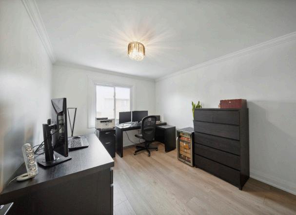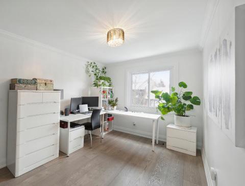 Enjoy a charming rest sanctum with engineered hardwood floors, a dazzling designer light fixture, crown moulding, and expansive windows overlooking the yard.