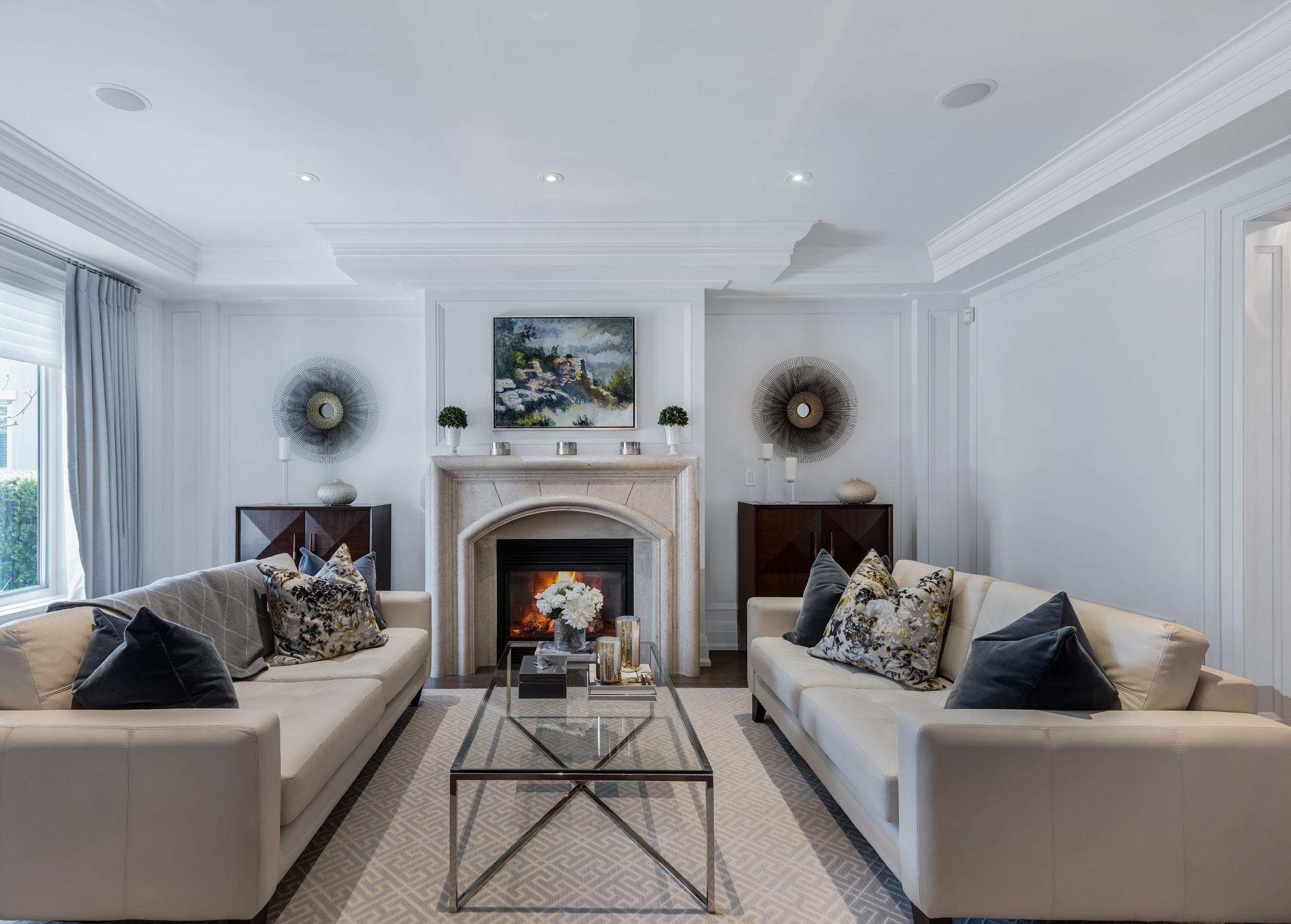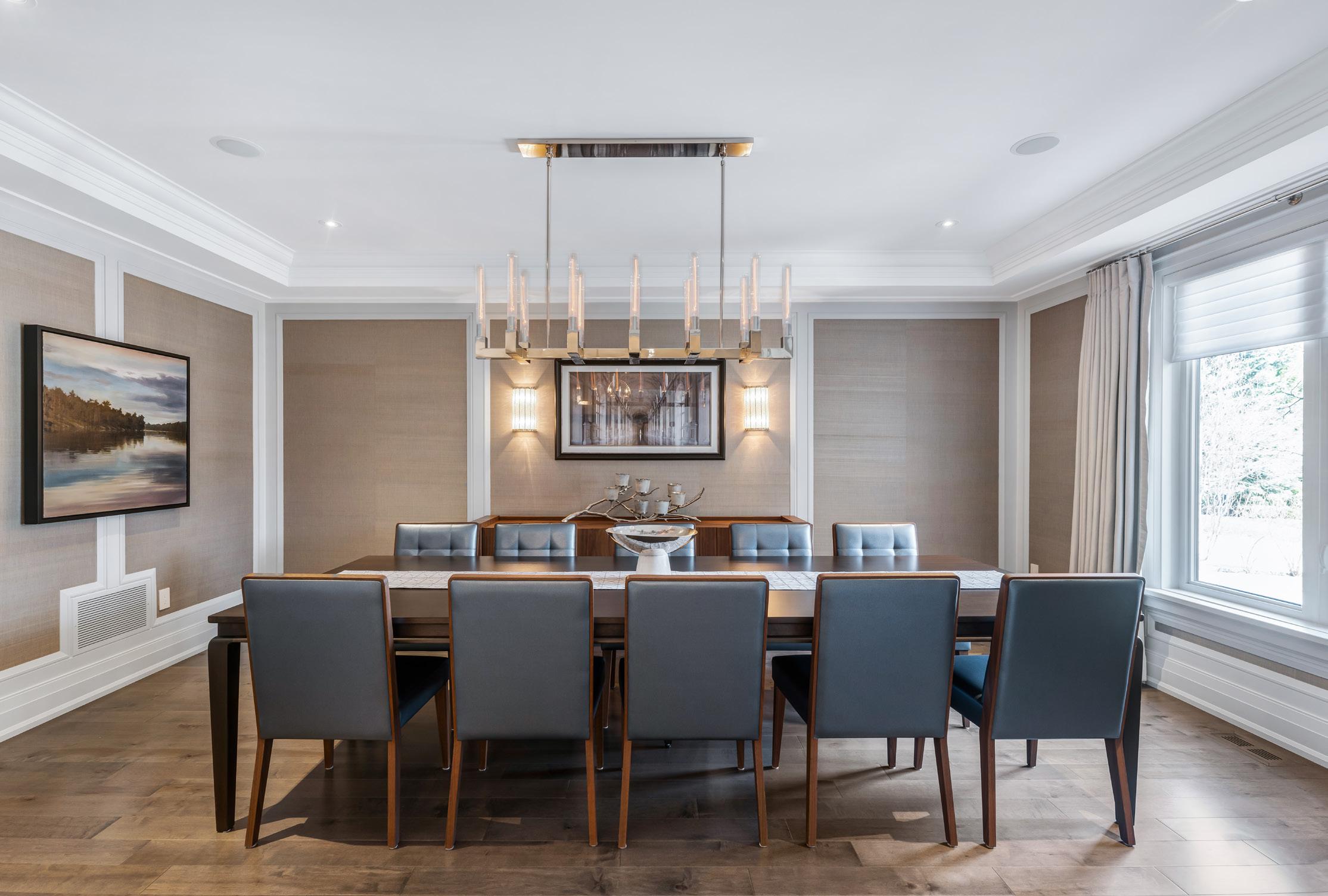 The living room offers a sophisticated ambiance with its Majestic Vermont Castings gas fireplace and custom mantle, creating a focal point of warmth and elegance. Large windows frame views of the front yard, while the cove ceiling adorned with pot lights and built-in ceiling speakers enhances the room’s luxurious feel. The dining room exudes timeless elegance with its formal design, complemented by sophisticated grasscloth wallpaper that adds texture and depth to the space. An expansive window offers serene views of the front yard, while the cove ceiling adorned with a sparkling chandelier, wall sconces, pot lights, and built-in ceiling speakers creates an inviting ambiance for memorable meals.