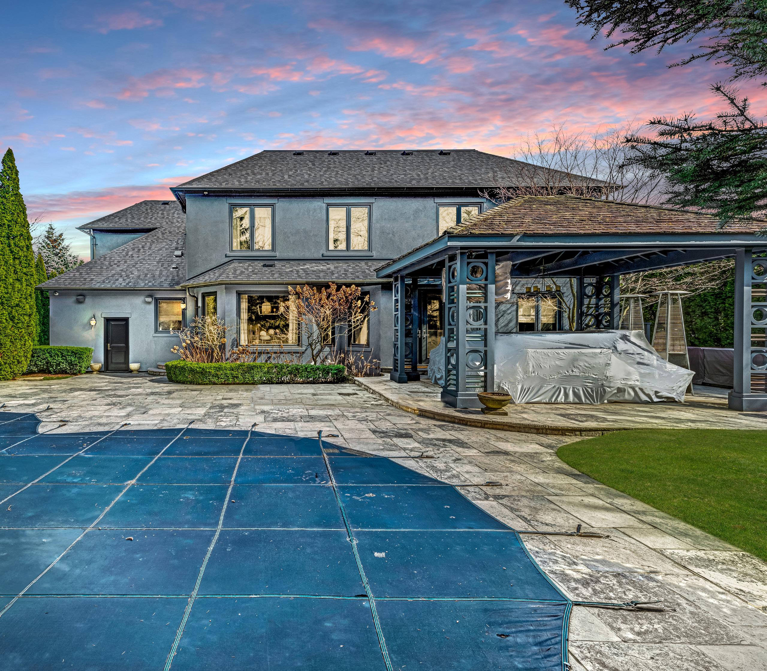 Adjacent to the pool, a custom oversized gazebo stands as a testament to refined outdoor living, providing shade and shelter for alfresco dining and leisurely lounging. Equipped with a built-in outdoor kitchen, this culinary haven allows you to entertain guests with ease while savoring the sights and sounds of nature all around.