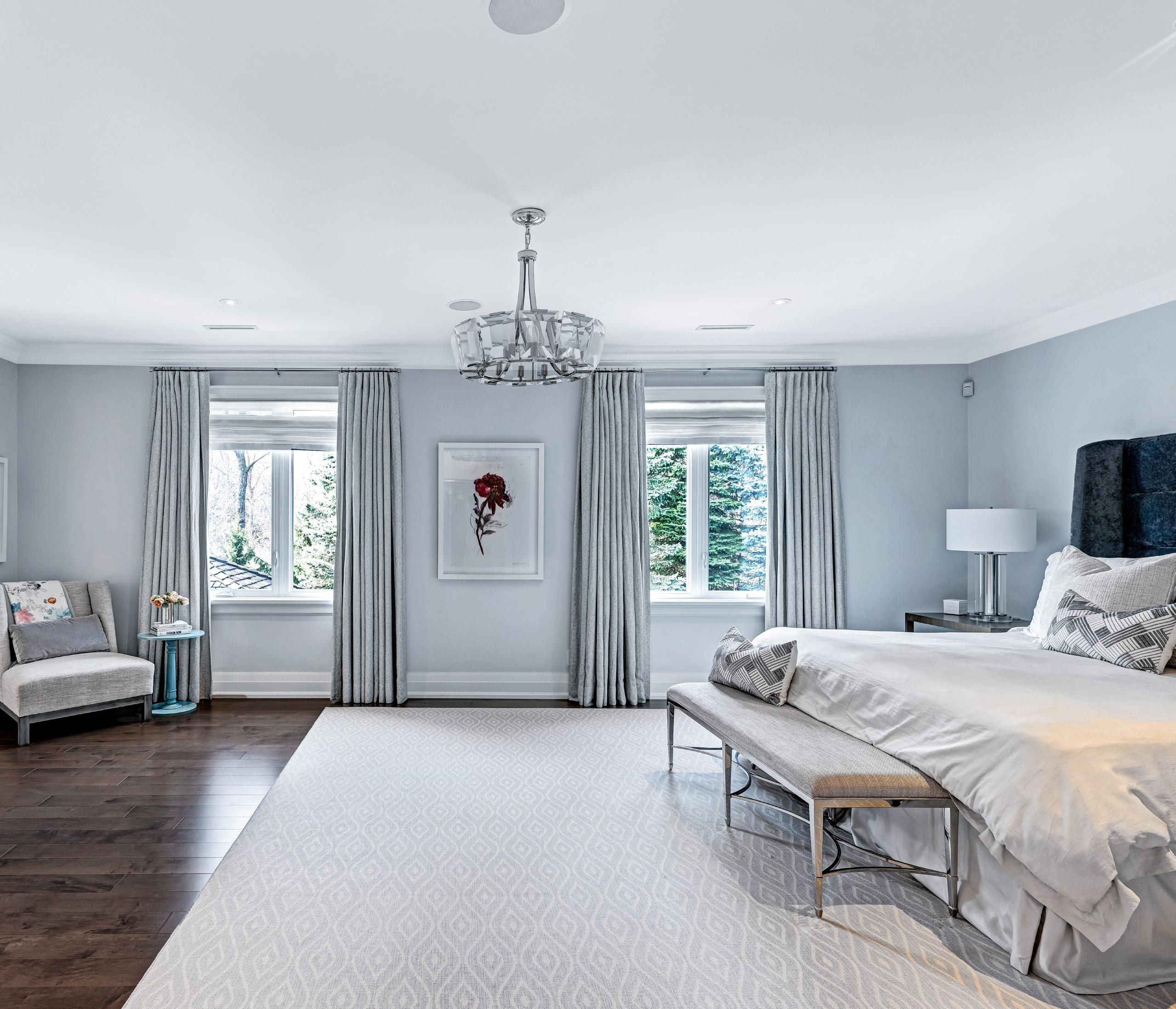 Welcome to the epitome of luxury and comfort, the primary bedroom. As you step into this sanctuary, you are greeted by two expansive windows that offer breathtaking views of the serene backyard, infusing the space with natural light and tranquility. A wall-mounted TV provides entertainment at your fingertips, while an exquisite chandelier, pot lights, and built-in ceiling speakers add a touch of opulence to the room.