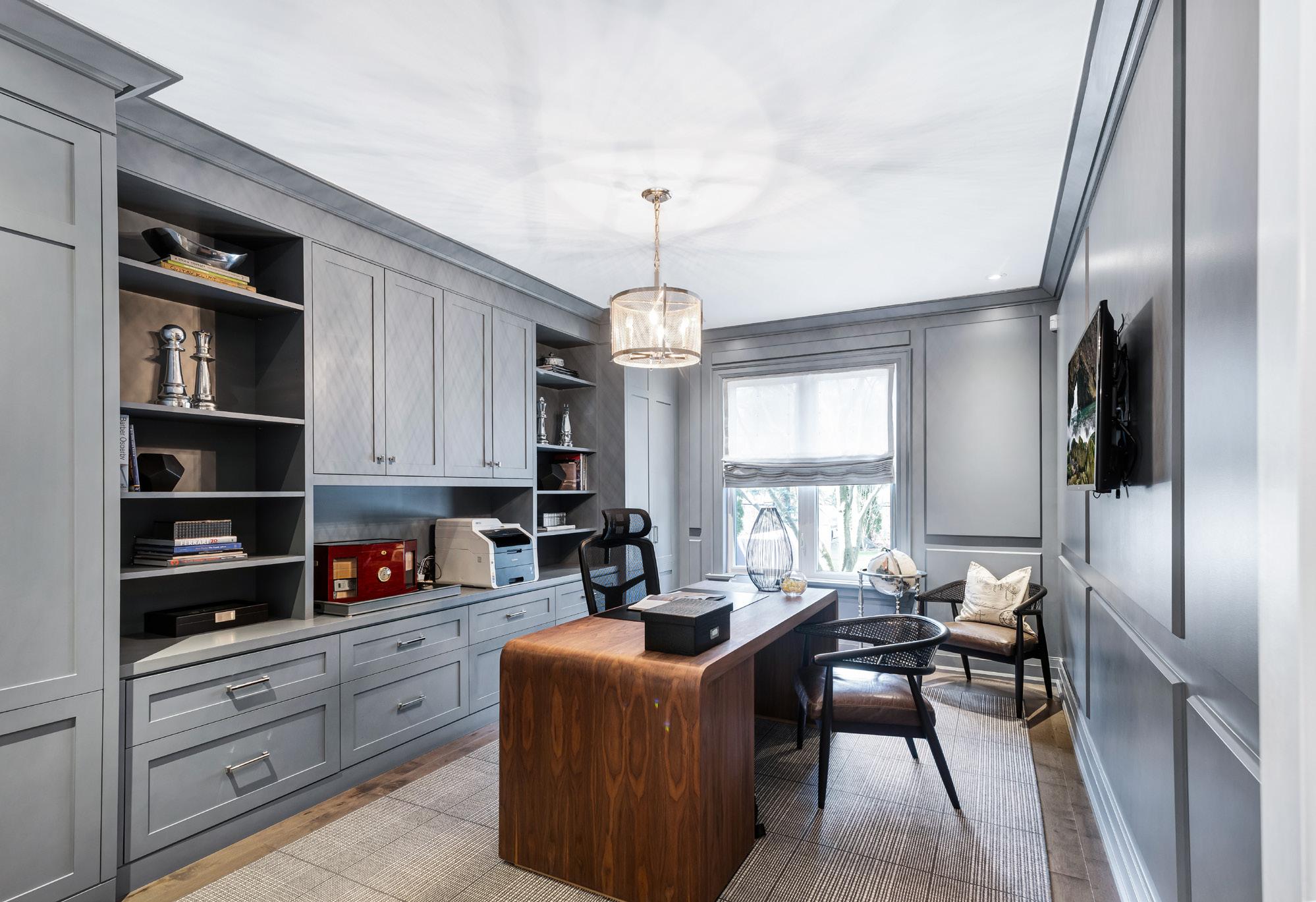 Designed for both relaxation and entertainment, the family room seamlessly integrates with the adjacent kitchen in an open-concept layout. A captivating feature stone wall houses a TV and gas fireplace, creating a cozy focal point for gatherings. Custom built storage, including cupboards and open shelving, offers both style and functionality, while double French doors provide easy access to the back patio, extending the living space outdoors. Pot lights and builtin ceiling speakers enhance the ambiance, making this room an inviting retreat for family and friends alike. Lastly, the office offers a refined and functional workspace, accessed through elegant double doors with glass inserts that invite ample natural light. Custom-built, wall-to-wall storage, extending from floor to ceiling, combines both cupboards and open shelving, providing ample space for organization and display. A feature wall with a wall-mounted TV adds a modern touch, while a window fitted with Roman blinds offers serene views of the backyard.