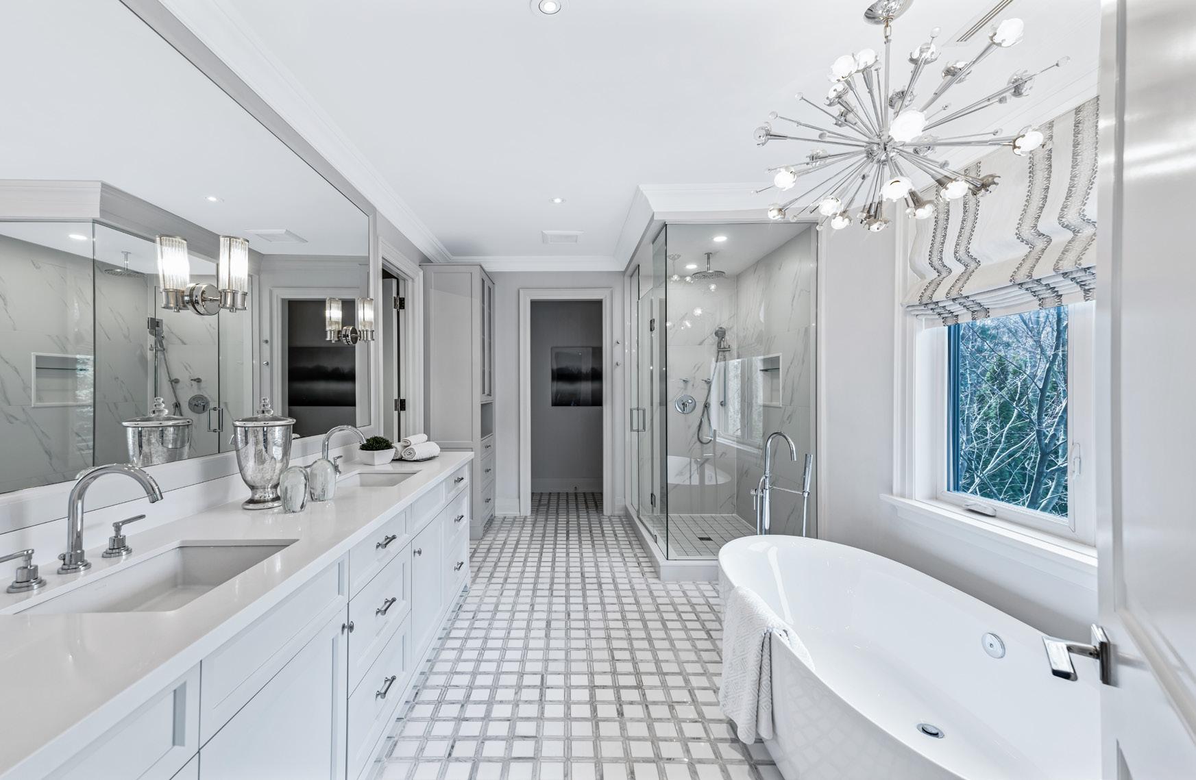 Indulge in the opulence of the 6-piece primary ensuite, where every element reflects a commitment to exclusivity and practicality. Dual vanities crowned with quartz countertops, mirrors framed with integrated sconces, and a freestanding deep soaker tub with a floor-mounted faucet and overhead chandelier create a spalike retreat for relaxation. A large glass-enclosed walk-in shower with rainfall and hand-held showerheads, and marble flooring elevate the bathing experience to new heights of luxury. Completing this lavish suite is a large window overlooking the side yard, a linen closet, and a walk-in closet with custom built-in storage and an electric light fixture.