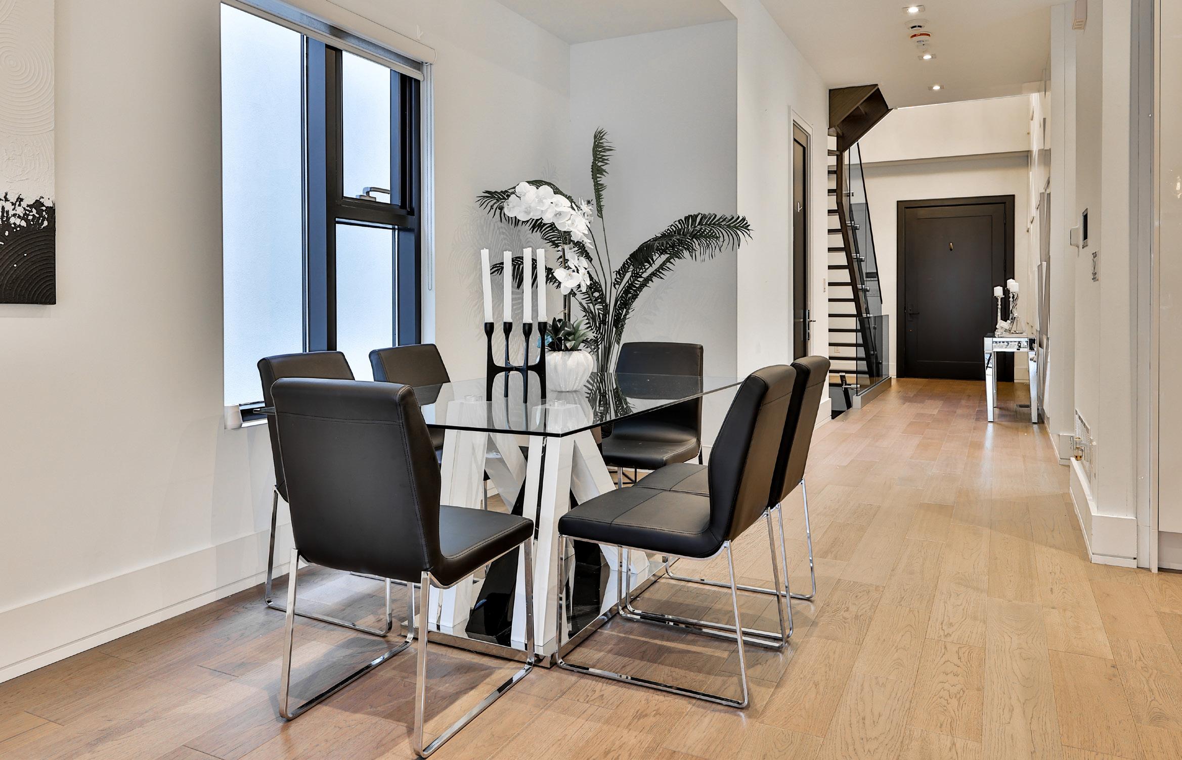 The open-concept dining room is a blend of modernity and charm, designed to accommodate both intimate family dinners and larger gatherings with ease. A large window allows natural light to illuminate the space, creating a welcoming atmosphere that is both cozy and sophisticated. The dining area is adorned with pot lights, providing ample lighting that highlights the room’s sleek design and wide plank engineered hardwood.