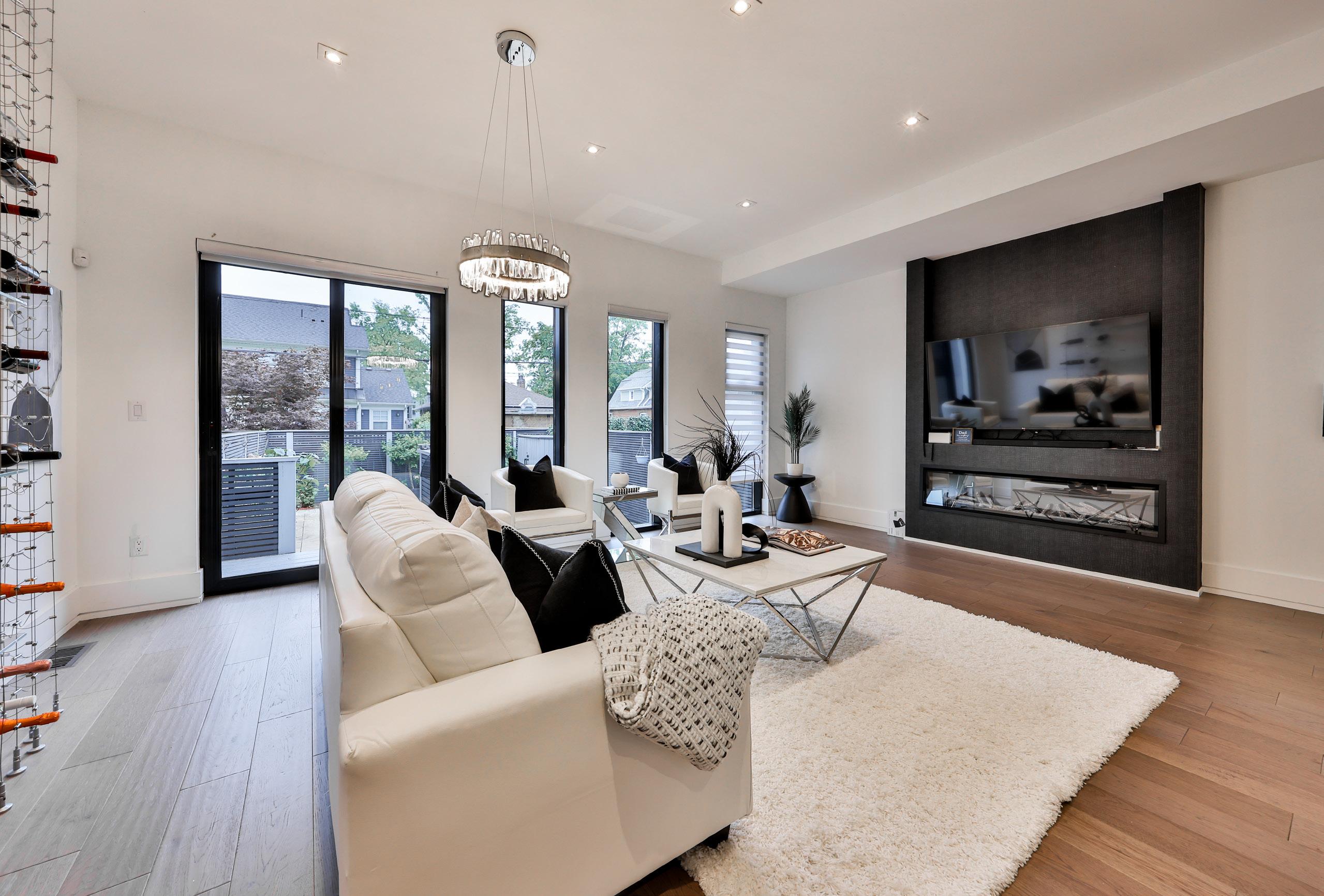Step into the family room, a true masterpiece of design and comfort, where modern elegance meets functional luxury. The centerpiece of this inviting space is the electric fireplace, set against a custom full-height feature wall that exudes both warmth and sophistication. This room is designed for both relaxation and entertainment, featuring a TV mount perfectly positioned above the fireplace for optimal viewing. Adding a touch of opulence, a custom built-in floor-to-ceiling wine rack serves as both a functional storage solution and a striking visual element, perfect for showcasing your finest collection. The family room seamlessly extends to the outdoors through a sliding door walkout, leading to the backyard patio, making it ideal for both indoor and outdoor gatherings. Natural light floods the room through full-height windows, creating a bright and airy ambiance.