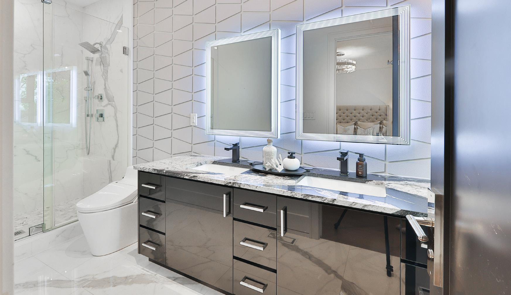 The pièce de résistance is the lavish 5-piece ensuite, a private oasis designed for ultimate pampering. It features a custom-built double sink vanity with granite countertops, offering ample storage with undermount cabinetry and drawers. Two wall-mounted LED backlit mirrors provide perfect illumination, adding a touch of contemporary elegance. The freestanding deep soaker tub invites you to unwind and rejuvenate, complemented by a detachable wand for added convenience. The walk-in glass shower, complete with a rainfall shower head and detachable wand, is a haven of relaxation, surrounded by elegant tile and hexagon tile flooring. A custom geometric wall adds a modern artistic flair, while the NuHeat floor thermostat and heated tile flooring ensure comfort in every season. Pot lights and an additional chandelier provide a luxurious ambiance, making every moment spent here a delight.