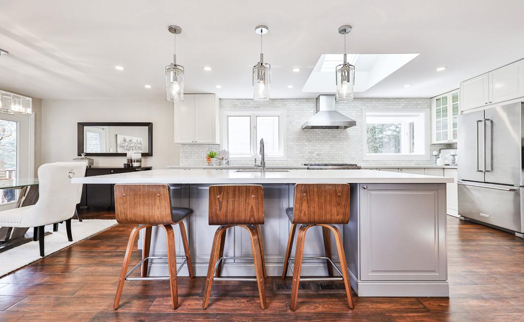The renovated eat-in chef’s kitchen, completed in 2018, is both functional and inviting. It features quartz countertops, a marble tile backsplash, and an oversized centre island with custom built-in cabinetry, a deep soaker sink, and barstool seating.