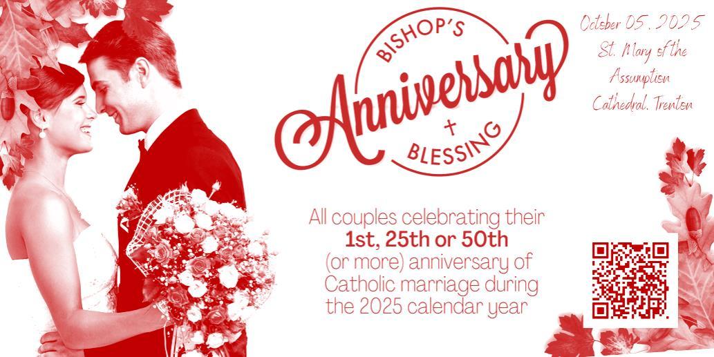 All couples celebrating their 1st, 25th or 50th (or more) anniversary of Catholic marriage during the 2025 calendar year For more information, visit https://dioceseoftrenton.org/bishops-anniversary-blessing