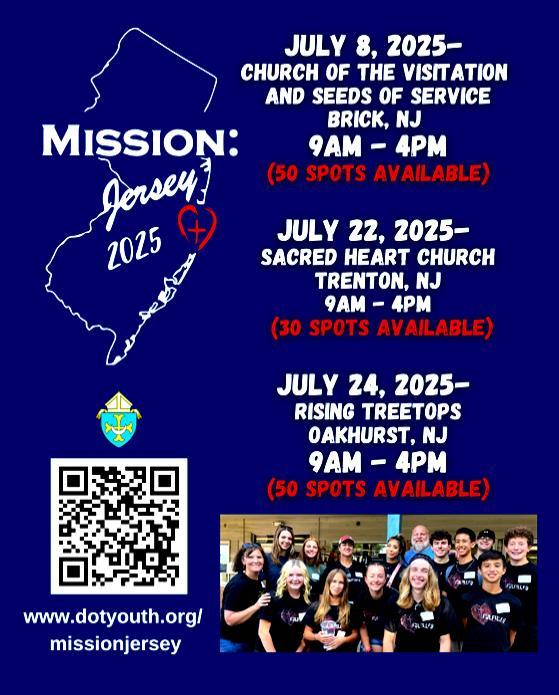 At the weekend Masses of July 26 and 27, special collection in support of church annual Missionary Cooperative Program Diocese of Trenton. This year we will have missionary to present the appeal in person ministry and needs. Thank you for your support!