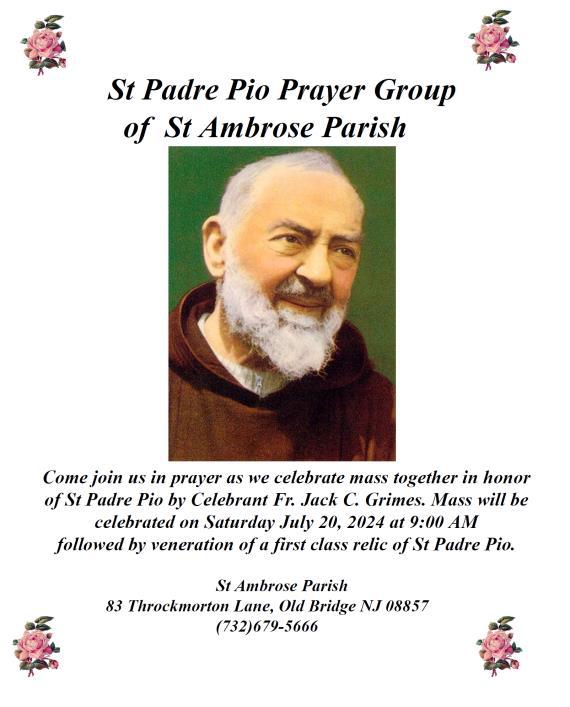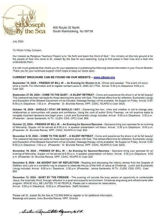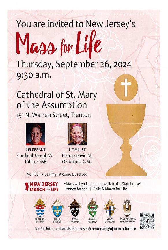 Next weekend, as the Universal Church observes the Feast of Saints Joachim and Anne, we will welcome families for a special intergenerational activity with grand parents and children. This is an important opportunity to encourage children and grandparents to talk about and learn about our Catholic Faith. Additionally there will. E the annual collection in support of the retired priests who have, and in many cases continue to, serve in our Diocese of Trenton. Thank you for generously supporting this effort
