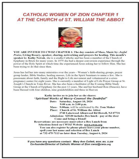 We will be welcoming Sister Ella Mae McDonald, MPF who will be offering the reflection at each of the four masses during the weekend of 10/11 August. This is part of the Society for the Propagation of the Faith Mission Cooperative. This is one way in which we can participate directly in the Church’s Missionary activity. We will have a drop box in the church for your monetary support. Consult another part of the parish electronic bulletin for how you may contribute through your online giving account. Thank you for your generous stewardship. Have a great week. Let us remember one another in prayer. Happy Sunday. Peace. Father Jeff