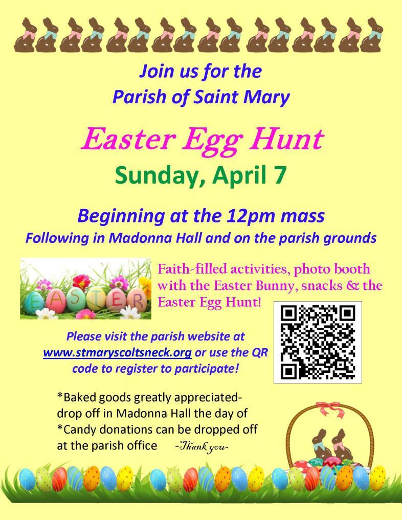 Our Easter Egg Hunt this year is scheduled for Sunday, 7 April 2024, the octave day of Easter beginningatthe12:00noon massandfollowing. Our thoughts are that there are so many activities leading up to Easter Sunday, why not try during the octave. This is a great opportunity for Children and Families to enjoy this event and reflect on the gift of new life we are promised in the Resurrection of Christ. Have a great week. Let us pray for one another and for those who are to be received into the Church next weekend. Happy Sunday. Peace.