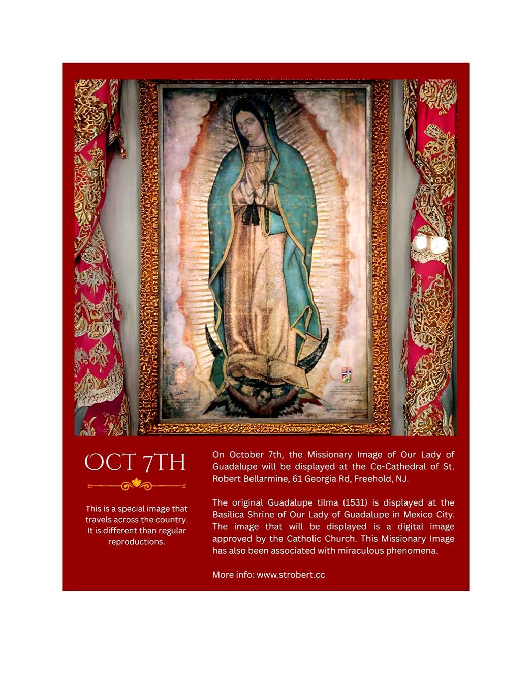 The Missionary Image of Our Lady of Guadalupe will be displayed. This image is a digital image approved by the Catholic Church and has been associated with miraculous phenomena. Visit strobert.cc for more information.