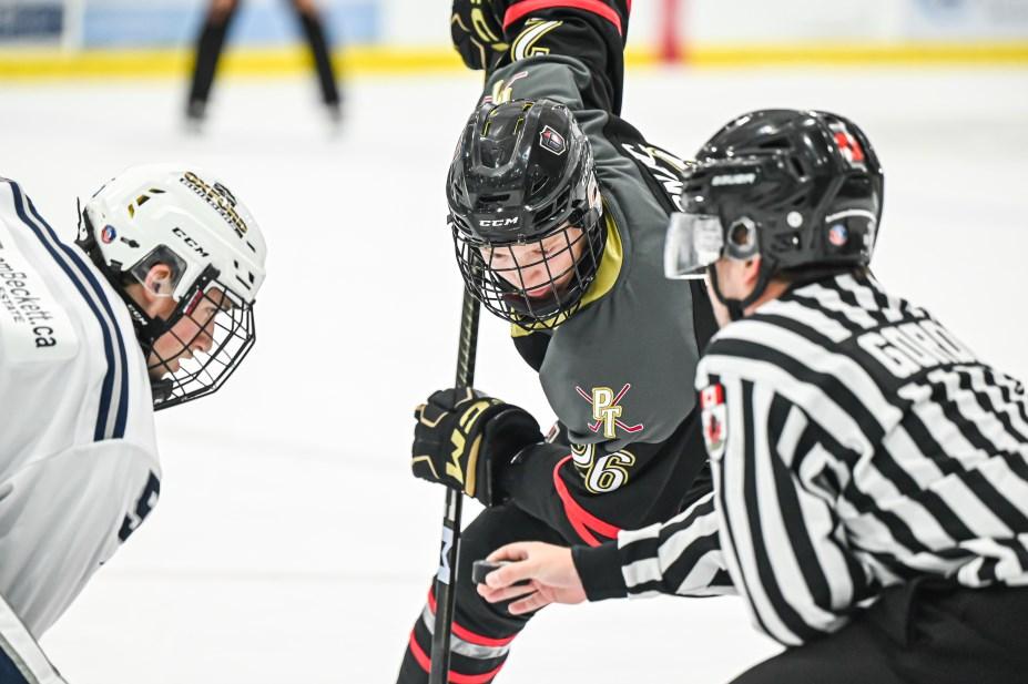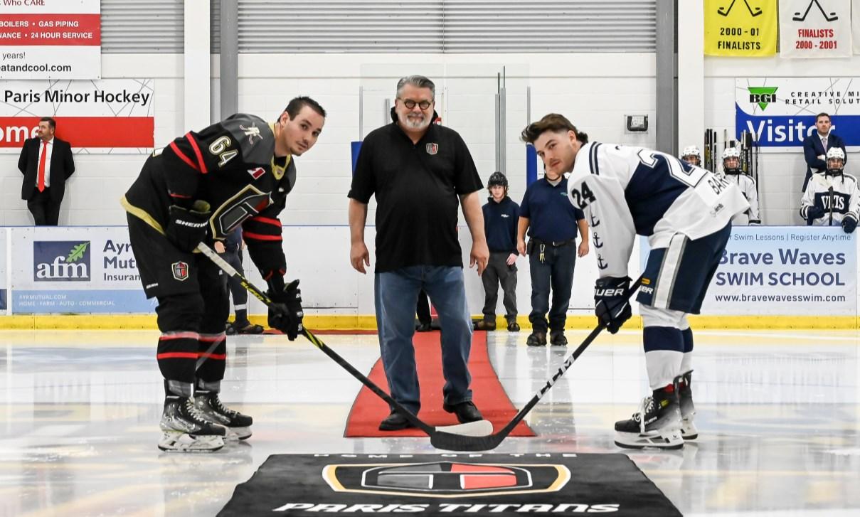 Mayor David Bailey drops the puck on the Paris Titans home opener last Saturday at the Brant Sports Complex. The Paris Titans dropped a 5-0 game to the Woodstock Navy Vets in front of a sold-out crowd of more than 600 people Paris’ next home game is this evening at 7:30 pm against New Hamburg Photo gallery on pages 14-15