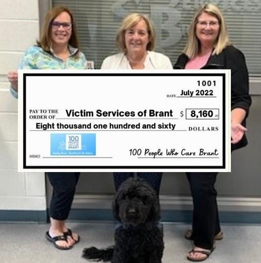 100 People who Care Brant completed another giving circle by donating $8,160 to Victim Services of Brant 100 People Who Care Brant Steering Committee members Shawna Sharp (left) and Kim Allardyce (right) present the donation to Penny McVicar, Executive Director of Victim Services of Brant, accompanied by Eddy, the service dog.