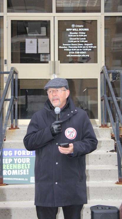 Approximately 70 people participated in a rally in downtown Brantford as part of province wide protests against Ontario’s Bill 23: More Homes Built Faster and proposals to take land out of the Greenbelt for development. It was organized by the Greenbelt West Coalition members Mary-Lou Knechtel, a resident of the County of Brant as well as Joan Telfer-Faux, a resident of Paris. Three Paris Councillors John Bell, Steve Howes and Lukas Oakley, also attended Bell spoke to the crowd about the impact of Bill 23 on municipalities, describing Bill 23 as “Democracy not at work.” He mentioned Bill 23 has “quite a few flaws” and it “undermines fundamental democratic principles.”