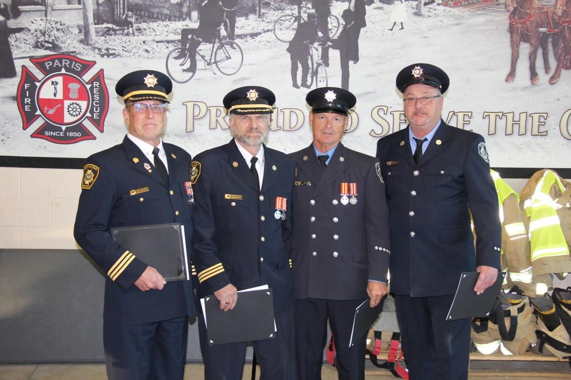 Four long-time and now retired Paris Firefighters were honoured during a special farewell ceremony at the Paris Station Pictured below are District Chief John Emerson, with 47 years of service, Deputy District Chief John Fazekas with 31 years of service, Firefighter Tom Croome with 37 years of service and Firefighter Bill Zavitz with 14 years of service. Thankyou gentlemen for your years of dedication to this community.