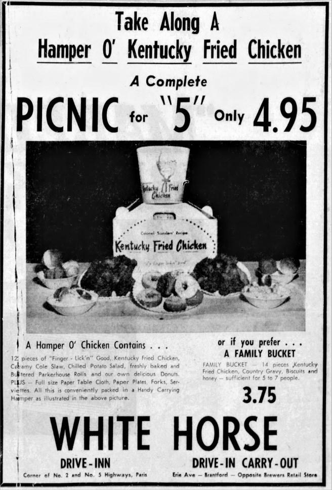 One of the many travellers to stop at the White Horse was the now famous Colonel Harland Sanders of KFC fame. In the early days of KFC the Colonel started his franchise by selling his secret recipe to restaurants for a nickel royalty on each bird sold. The White Horse was not only one of his earliest franchises, eventually opening a stand-alone take-out restaurant beside the White Horse, Fletcher Wilson and his partner Ian Oliver would go on to own and operate a total of ten KFC take out restaurants as well as the salad commissary which they opened across the street. The stores were located in Brantford, Paris, London, St. Thomas, Delhi, and Simcoe. In 1970 the White Horse