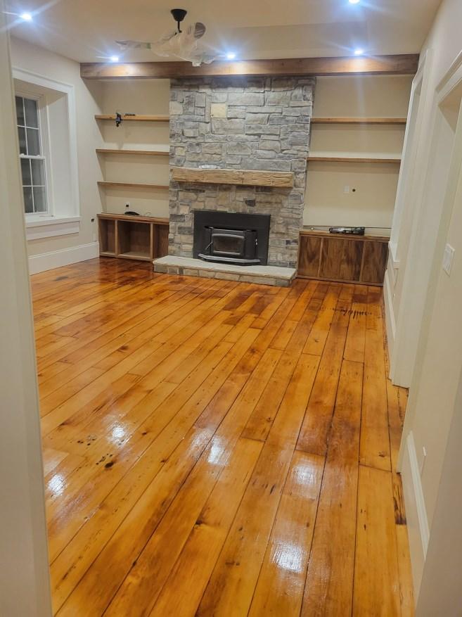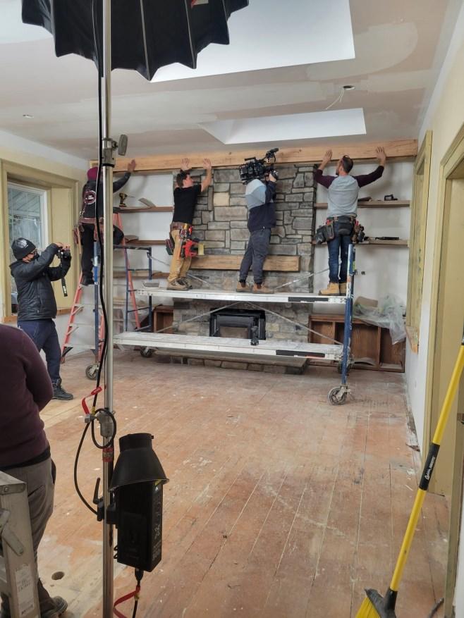 The cast and crew of HGTV Farmhouse Facelift work to install shelving around a newly constructed fireplace (far left) and check out the shine on that restored pine flooring (left), courtesy of Hagey Hardwood Flooring & Staircase.