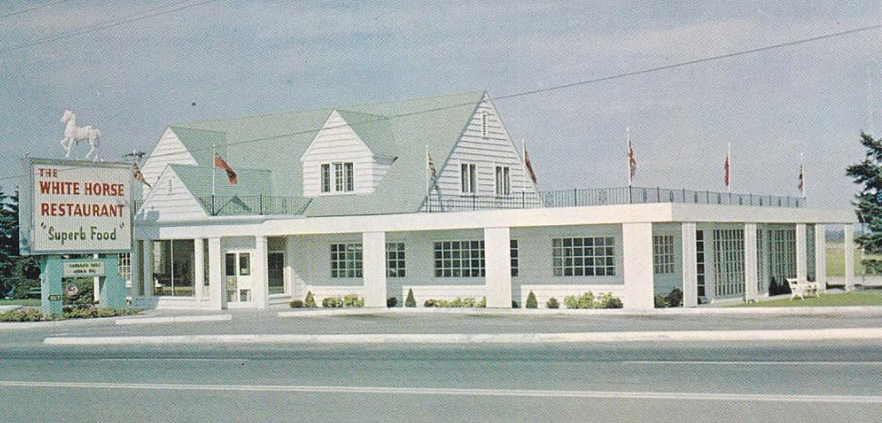The White Horse restaurant, which was located on Dundas Street just East of Paris, was operated by Fletcher Wilson from 1934 to 1970 The restaurant got its name from a white carousel horse, visible here over the entrance, which Wilson brought from Port Dover after a fierce 1929 storm had destroyed the merry-go-round Both photos on this page were postcards and the one below shows the restaurant after the 1956 expansion & renovation.
