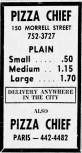 you were still hungry, delicious desserts awaited. There was chocolate cake, pies and a great children’s favourite, tin roof sundaes! The pies and cakes were baked at Pizza Chief’s commissary in Paris. There was root beer, chocolate milk, and Coca-Cola served in frosty mugs for the youngsters and cocktails, beer and wine for mom and dad, A whole bottle of Mateus would cost only $6.05. The Pizza Chief was open seven days a week and could host large or small parties Eventually the Pizza Chief moved to a brand new location on Hwy #2 (where the Full Plate is now) and the old location was re-opened as the famous White Horse Restaurant once again and continued to be the favourite dining room in Paris until about 2008.