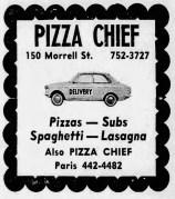Paris used to have one restaurant that truly appealed to adults, children, and teen-agers alike. The Pizza Chief Restaurant was relocated from downtown Paris to its new 200 seat location at 115 Dundas Street after the Hungry Lion closed in the once famous White Horse Restaurant location. Owner Brian Booth established the first Pizza Chief in Paris in 1969. It proved so popular that he built a larger restaurant in Brantford in 1971 Business was brisk from the start and he expanded the facilities in 1976 Shortly after this he purchased the defunct restaurant The Hungry Lion and turned it into another Pizza Chief like the one in Brantford with its Tiffany lamps and checkered tablecloths. At the Pizza Chief mom, dad and the kids could drop in for a full meal or just