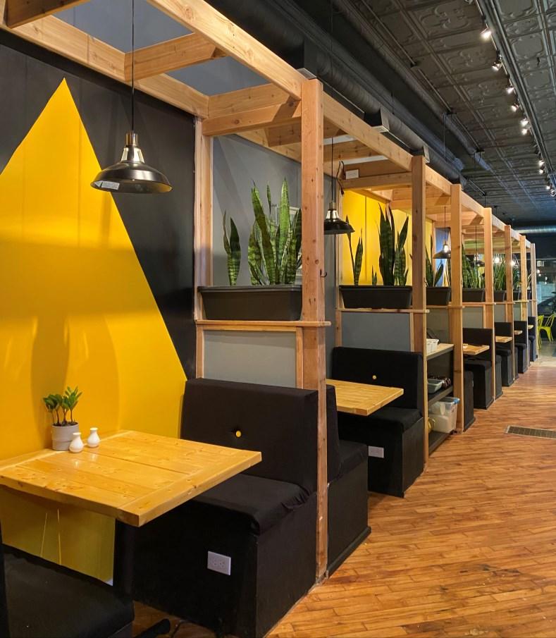 The inside of the building is modern with bright yellow and dark black paint as a contrast, and many plants and neon lights hung for décor. A lounge couch hangs in the back corner by the bar with a view of the Grand River just behind. The old windows in the newly renovated building surrounded by modern décor show the fusion between the history of Paris and all that is to come, led by Arepa