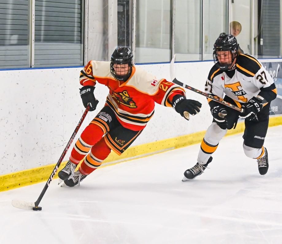 Left, Brady McLaren battles for the puck during a face off. Right Matt Burtt skates towards a play