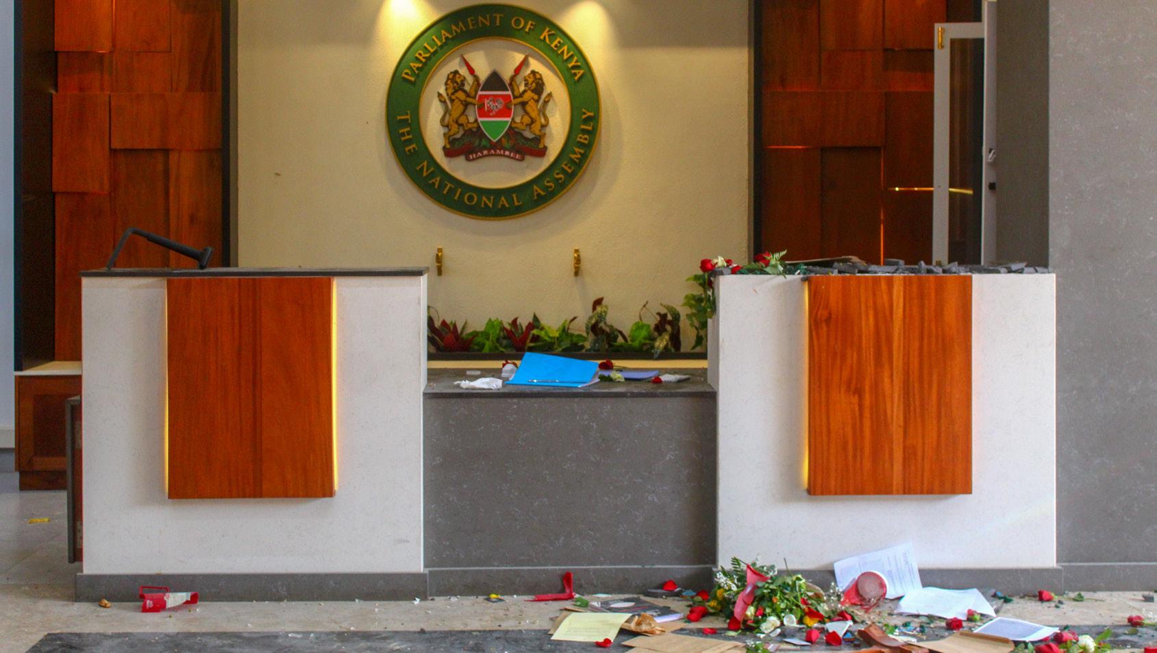 Damage left to the National Assembly of Kenya following the storming of the Assembly building in 2024.