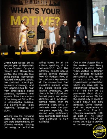 One of the biggest hits of the weekend was Nancy Grace’s session called “Lady Justice Is Calling!” Our favorite television personality and former prosecutor led an impassioned presentation where she dove into her experiences growing up that led her to be passionate about victims’ rights and justice. We had the opportunity to speak to Grace about her new podcast, Crime Stories, and her experience at Crime Con. The full interview is available HERE as part of The Peach R e v i e w ® ’s “ P E O P L E ” series but enjoy a preview on the next page: