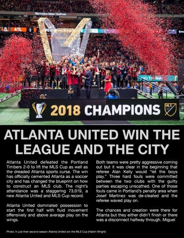 ATLANTA UNITED WIN THE LEAGUE AND THE CITY Atlanta United defeated the Portland Timbers 2-0 to lift the MLS Cup as well as the dreaded Atlanta sports curse. The win has officially cemented Atlanta as a soccer city and has changed the blueprint on how to construct an MLS club. The night’s attendance was a staggering 73,019, a new Atlanta United and MLS Cup record.