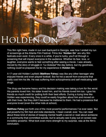 Holden On This film right here, made in our own backyard in Georgia, was how I ended my run of screenings at the Atlanta Film Festival. Films like “Holden On” are why film festivals even exist. Every once in a while, if you’re lucky, you’ll sit through a screening that will impact everyone in the audience. Whether its fear, love, or laughter, everyone wants to feel something after seeing a movie. I was already moved by the story of struggle in “La Soledad” the day before, but my goodness, nothing could’ve prepared me for my experience in Holden On. A 17-year-old Holden Layfield (Matthew Fahey) was like any other teenager who enjoyed friends and even played football. But he hid a secret from everyone that sadly cost him his life. He was suffering from schizophrenia and self medicating with drugs. The drug use became heavy and his decision making was taking a turn for the worst. His parents loved him, his sister loved him, and his friends loved him too. I give his friends so much credit for putting forth their best efforts. During a trying time like Holden was experiencing, they could’ve easily forgotten about him and moved on with their lives. But they didn’t because he mattered to them. He had a presence that everyone loved (even the other kids at school). Matthew Fahey put forth one of the most powerful performances I’ve ever seen. Not just powerful by film fest and indie standards, I mean overall, ever. You can read about these kind of stories of keeping mental health a secret or read about someone in a community that committed suicide, but to actually see it play out on screen was incredibly powerful. What took even more strength to my surprise, was at the film’s conclusion,