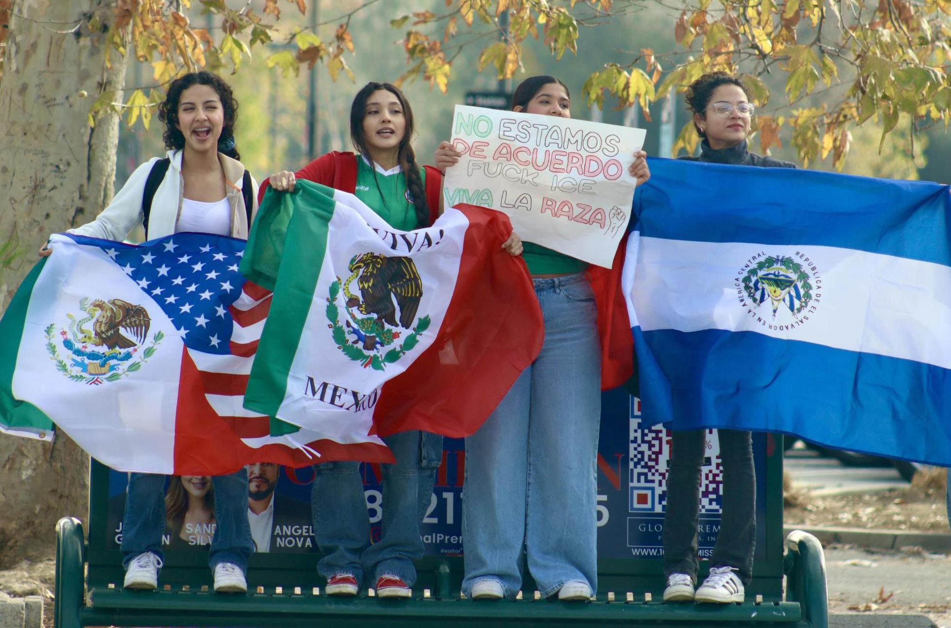 Senior Vanessa Morales, junior Guadalupe Martinez, senior Angelique Mendoza and senior Allison Gonzalez hold flags and signs to protest anti-immigration policies while standing on a bench. Students cross the street holding flags and signs while protesting. While at the Van Nuys Civic Center, junior Delilha Trujillo shouted into a megaphone about standing up for the immigrant community. “I think it’s important for all of us to stand together right now and make it up for those who can’t,” Trujillo said.