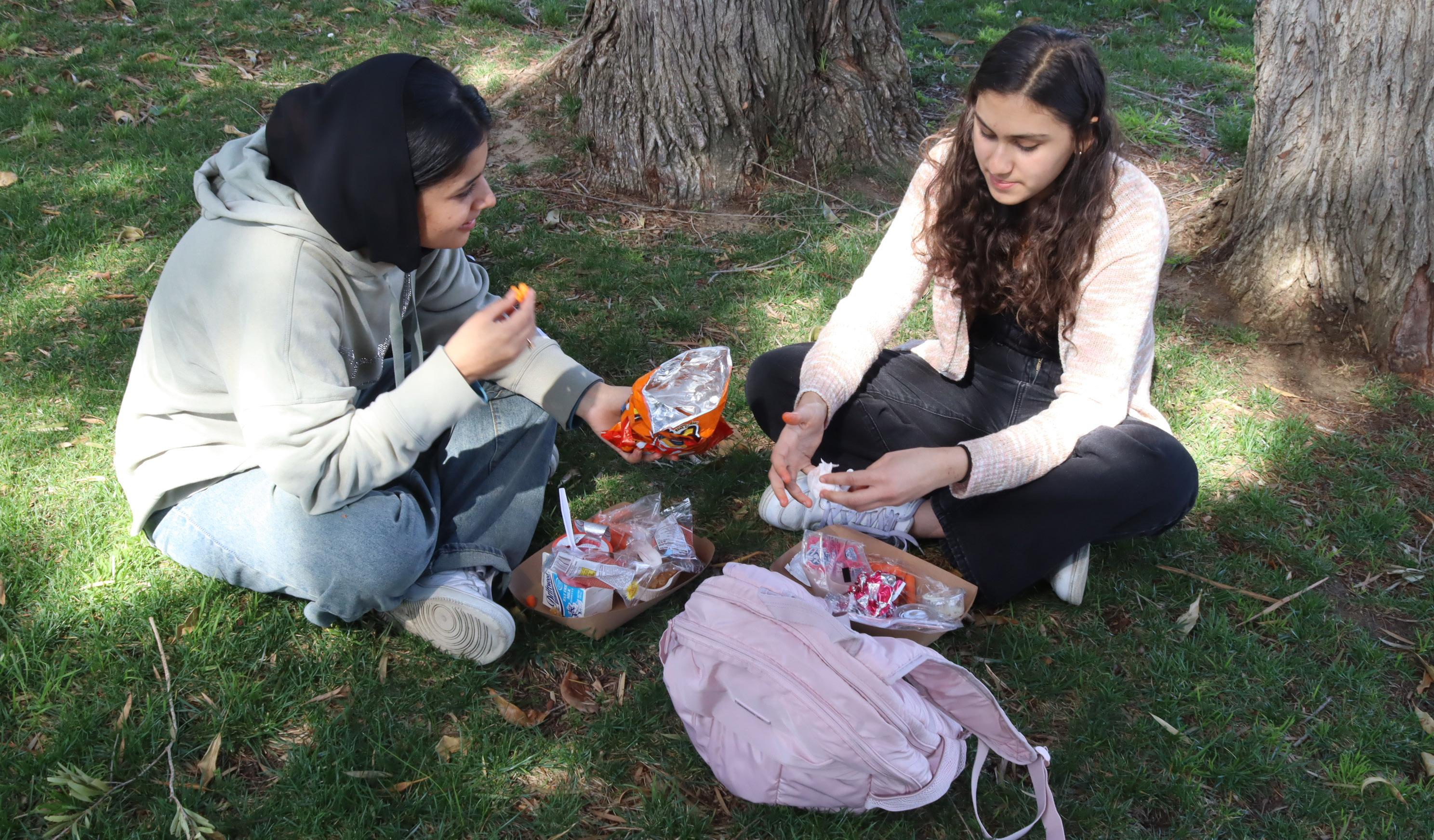 Senior Behishta Safi and junior Mirolla Abdelmasih eat lunch in the front grove on Feb. 18. Due to the phone ban, students cannot use phones during break periods.
