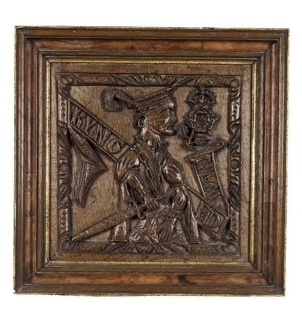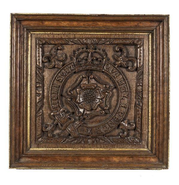 A set of three carved oak panels, English, circa 1550 Depicting Edward VI (1547-1553), King Solomon and the Motto of the Order of the Garter ‘Honi soit qui mal y pense’ around a Tudor Rose | Sold for £15,600