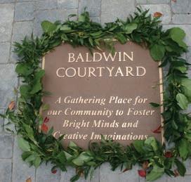 The Baldwin Courtyard, named for David Baldwin ’47, is dedicated. The courtyard was created by architect Chris Brown, and sculptor Robert Shure designed the statue of Dr. Pingry, The Beginning of Wisdom. Pictured are Mr. Baldwin, then–Head of School John Neiswender, and then–Board Chair Vicki Brooks P’02, ’04.