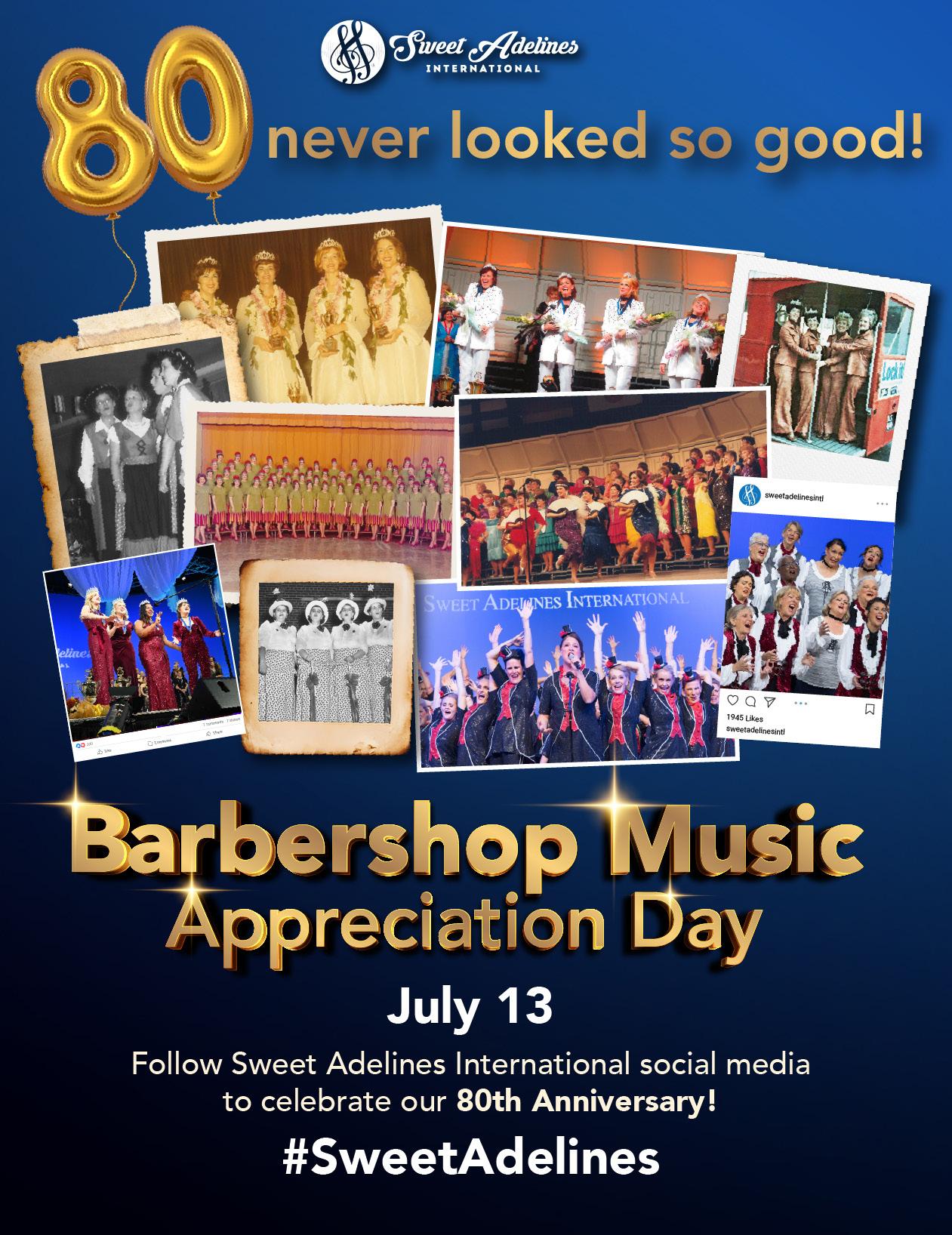 How will you celebrate our 80th anniversary with your chorus or quartet? On or around our anniversary, post photos or videos of your celebration so we can share on Sweet Adelines International social media! Also, make sure to enter your celebration photos in the July Mission: Retention contest. See page 35 of this issue for more information.