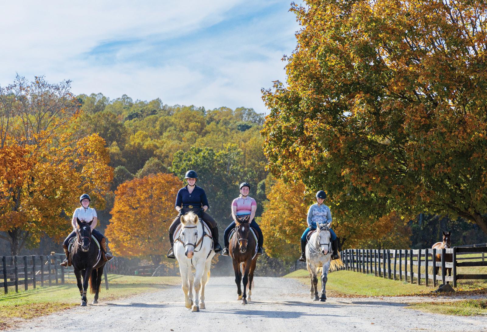 FROM LEFT: Riding class on a walk; Katherine Atherton ’25 at 2022 NCEA Nationals. 2022 ECAC Fences Rider of the Year, Freshman Rider of the Year and 2022 NCEA All-America Honorable Mention Flat Rider; Brittany Aiken ’22 in the Howell Lykes Colton Stables; Overhead of the Harriet Howell Rogers Riding Center
